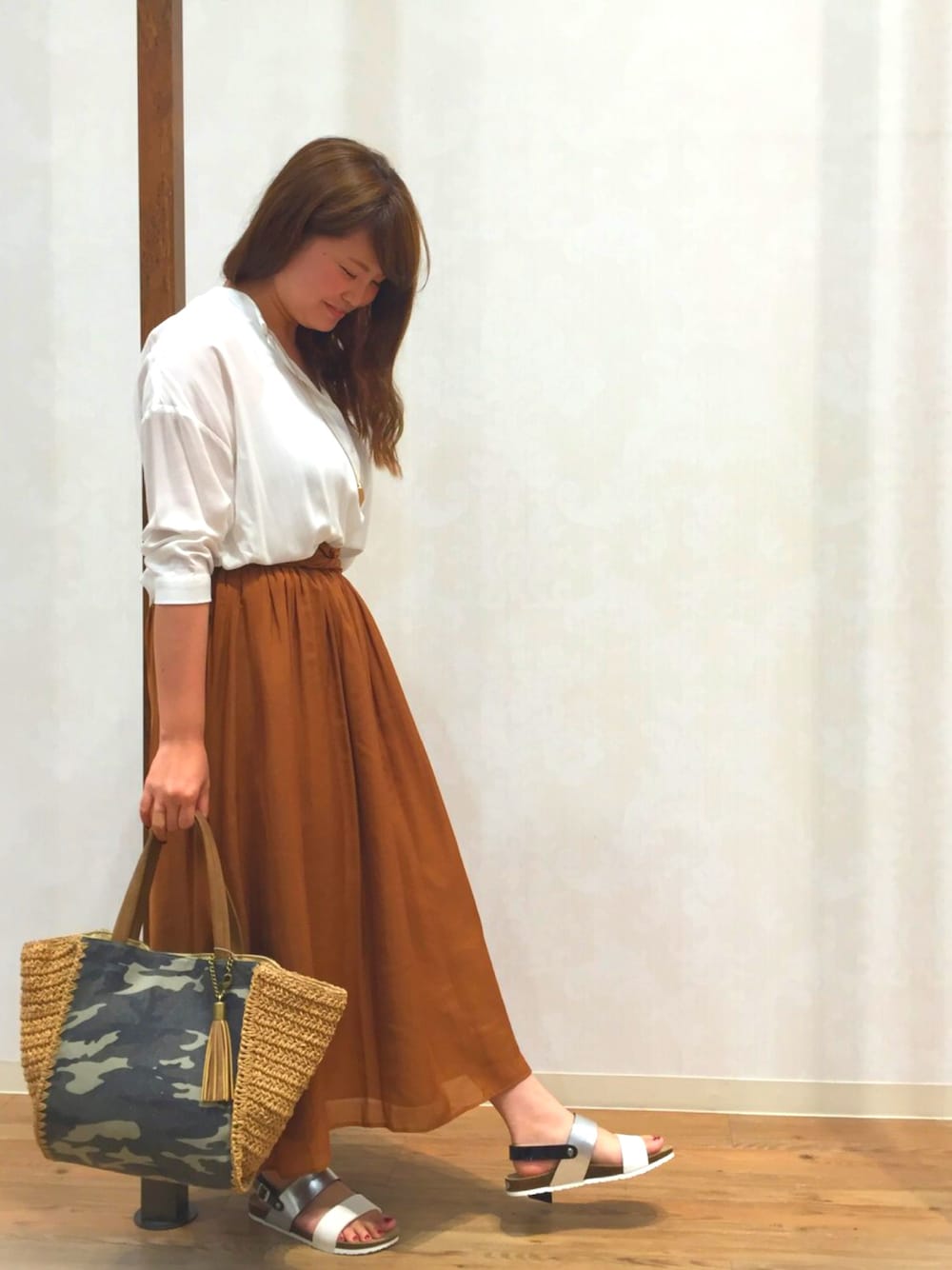 トレンドのテラコッタカラーを取り入れてみました😉!サラッとした素材で夏でも涼しいマキシスカートです☝️ウエストのデザインもINして見せたいですね😆💓 レーヨンシャツはフロントにタックが! パンツで合わせると前はスッキリ✨後ろはヒップが隠れます👌🏼✨ウレシイ! まだ少し肌寒いので露出は少なく🌀小物は夏仕様にしました😋💕 _(改装に入りました!リニューアルオープンが楽しみです!)