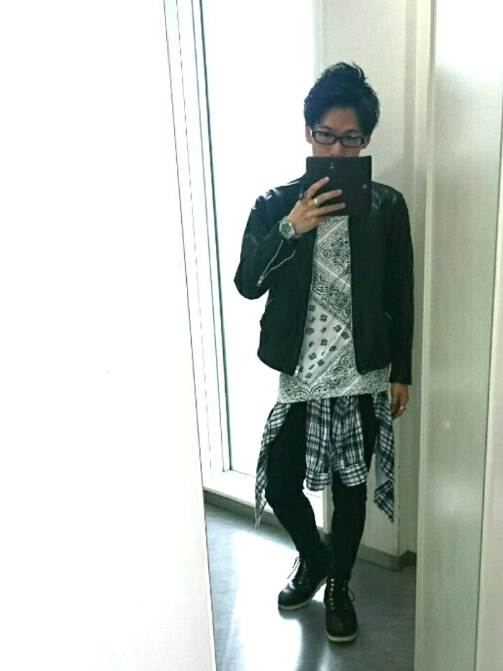 アップバングできるくらいに短くしたのでレザージャケット着ました👏😆 髪が長い時は似合わなかったので😞 これからはまた少し伸ばしてモード感の強い服を着ていこうかなと思ってるので、あんまりレザーは着ないかな😔 黒のスキニーで無彩色多めなのでモードストリートっぽい感じも出てるかなーと思います😉👍