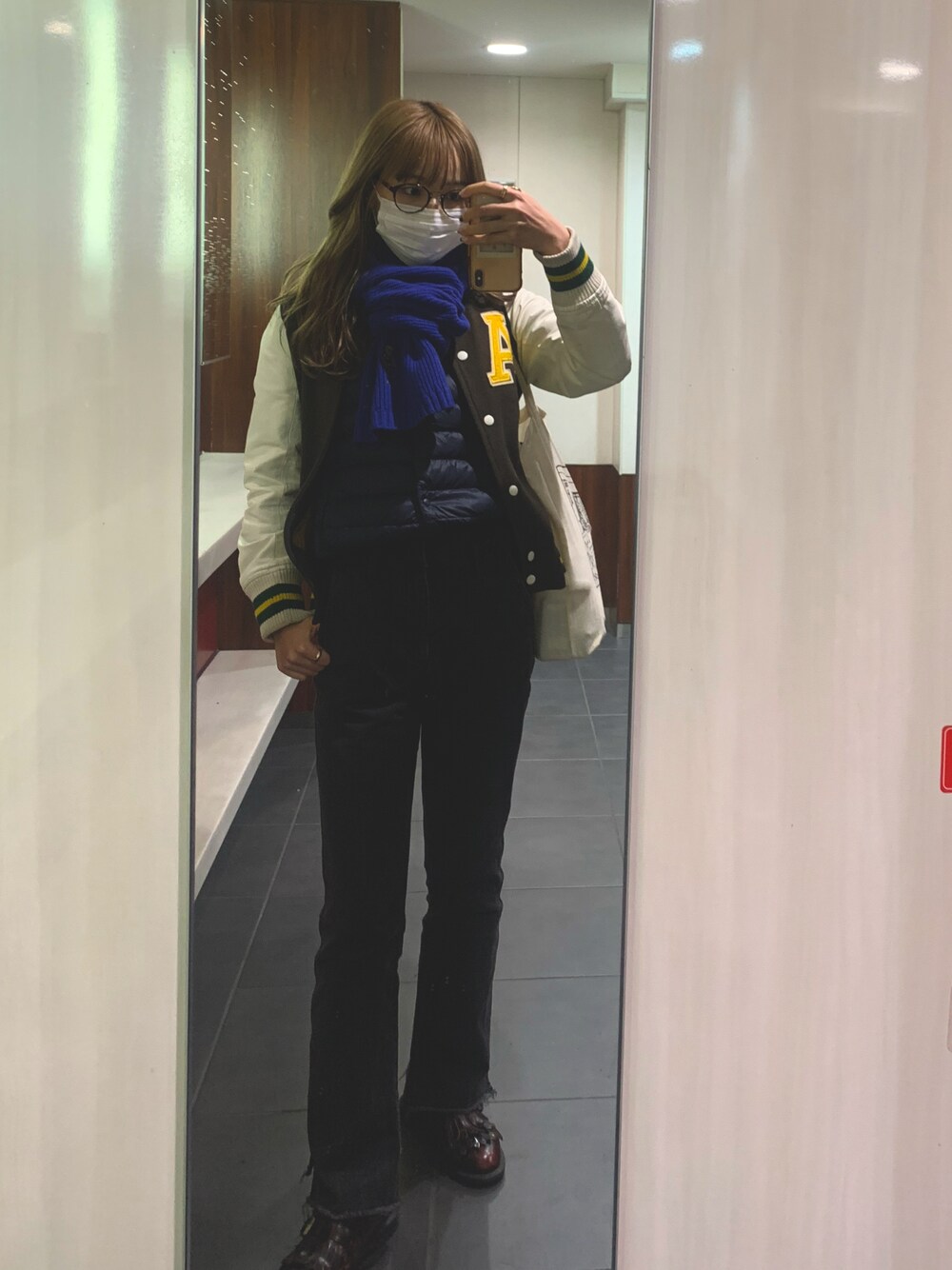 最近目を酷使しすぎてるから、メガネ👓day アーノルドパーマの深みどりのスタジャンはお母さんが20代の時に着てたおさがり✌️ マーチンのローファーはフリマで5000円でゲット🤞 ええ買い物やあ〜