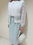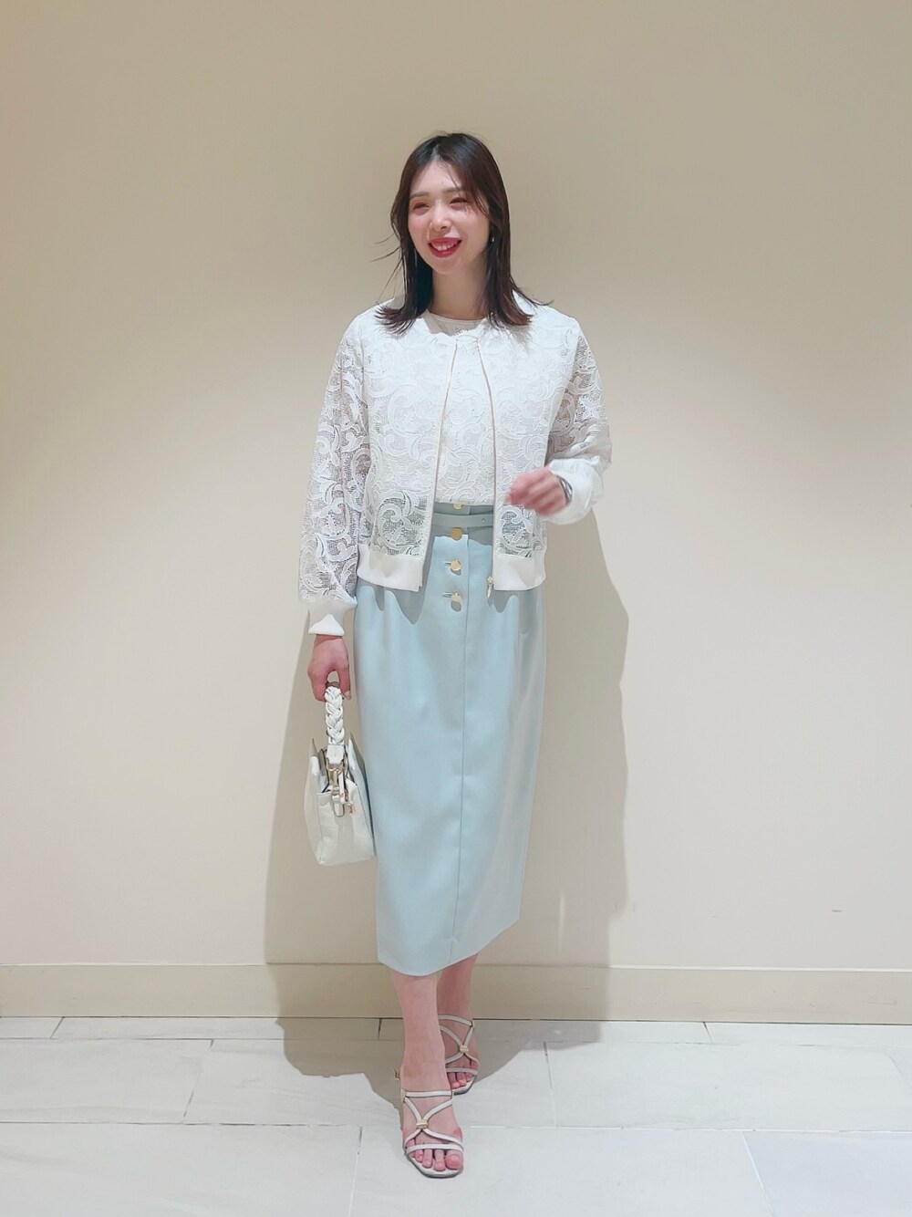 【レースブルゾン】 ワンピースの羽織に使いやすいブルゾン。 ハリ感がありしっかりとした素材です。 レース部分は伸縮性が無いので、ゆとりがあるデザインとなっています。大きすぎる感じではないです。 自宅での手洗いも可能なので、夏の羽織物として重宝する1枚です。 【レースレイヤードニット プルオーバー】 ニット地部分はさらりとした肌触りでインナーとして着心地良く、ロングシーズン活用しやすいです。 1枚でも着用しやすいよう二の腕がカバーされるデザインとなっており、1枚で華やかさもあります。 手洗い可能なので、これからの時期に活躍します。 普段着用しているサイズで大丈夫です。 レースに伸縮性はないですが、本体部分は多少あります。後ろボタン付けたままでも脱ぎ着できました。 【ブライトツイルタックタイトスカート】 適度な張り感とコシ、ふくらみ感のあるツイル素材を使用したタイトスカート。 ハイウエストのボタン開き風のタック入りストレートシルエットなので、スッキリ見えします。ヒップはタイトスカートの割にゆとりがあります。 サイズは普段着用しているサイズで大丈夫です。 ハイウエストなので少しウエスト周りにゆとりがありましたが、トップスインをするとちょうど良かったです。