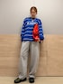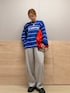メンズlottoシャツとサニーレーベルのスウェットパンツでゆるっと感を出しつつ、メガネやオレンジバッグ、パールネックレスなどの小物で甘さを足すとレディースでも可愛いく子慣れた感じになります♡