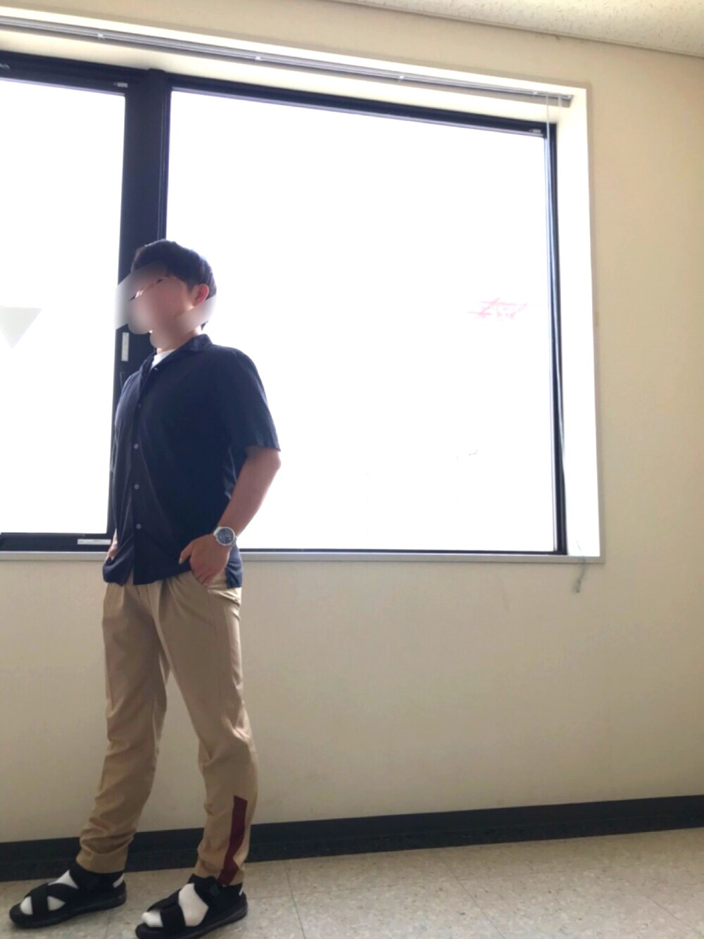 夏のコーデ トレンドのオープンカラーシャツとキャメルのスラックスを合わせてみました!! パンツは赤のラインがアクセントになってます!! サンダルはハレのサンダルで定番の白靴下で合わせてみました!!! 時計は学生ですが奮発してアルマーニ買ってみましたー!