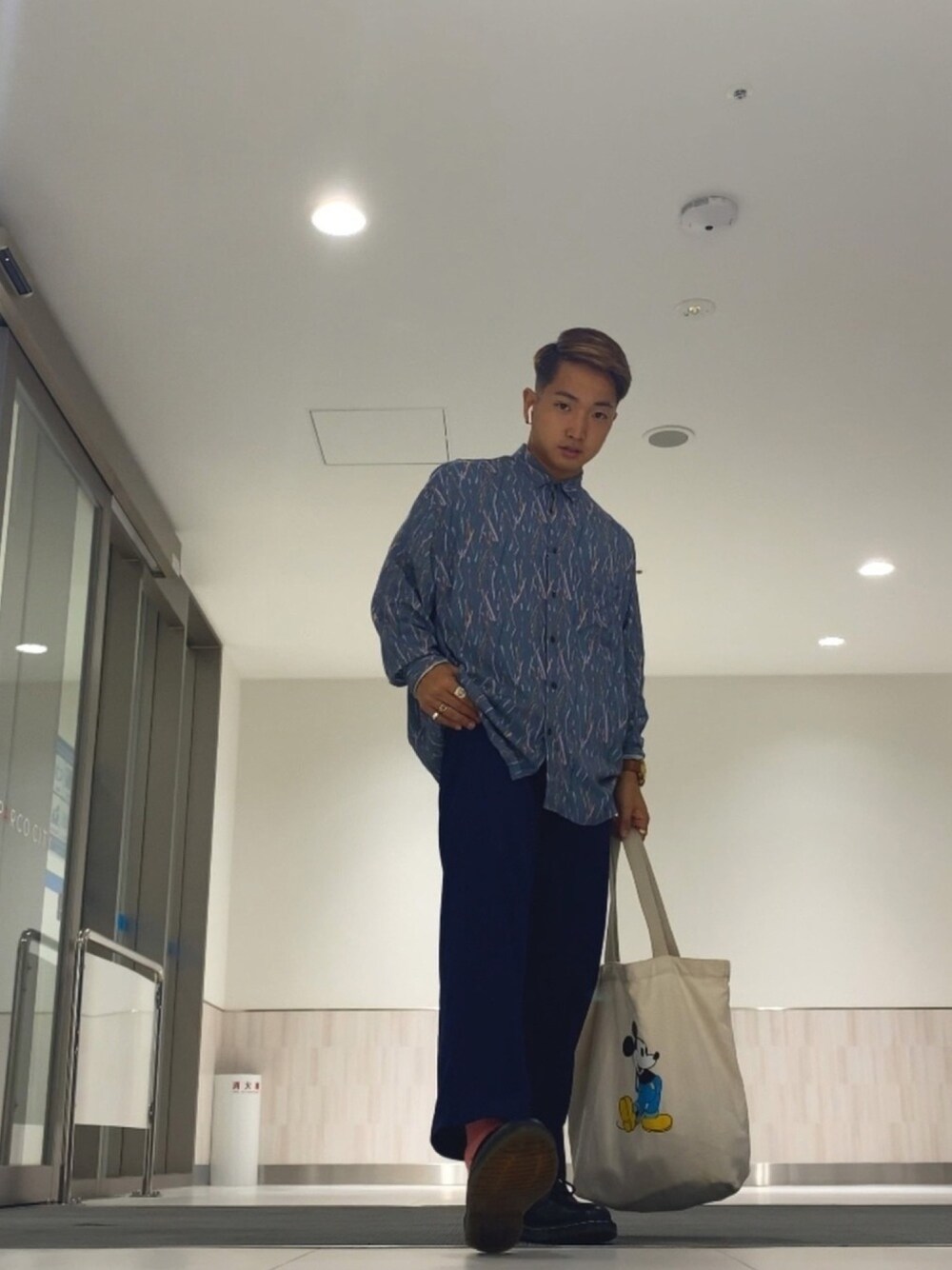 こんにちは🌞 今回は同系色でまとめてみました! ブルーのシャツとスリットパンツでスラッとさせる事を意識して、 ドレスシューズを合わせて爽やか🌃かつ少し大人っぽさを表現させました! 小さ目のバックでも合うと思うんですけど、 ちょっと荷物が多かったので今回はトートバッグにしました笑