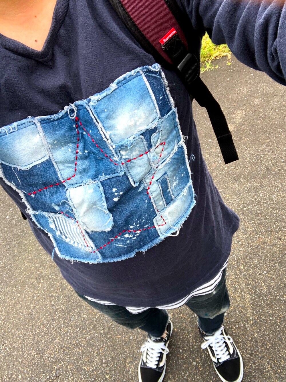 デートコーデ❤️ 愛娘とデート❤️ リメイクTシャツにユニクロのデニム バックパックはシュプリーム バンズの定番オールドスクールのブラック😃
