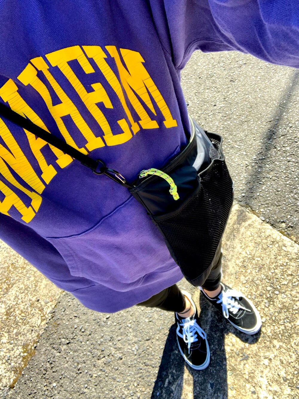 休日コーデ😃 ビックパーカーにライン入りパンツ スニーカーはバンズ☺️