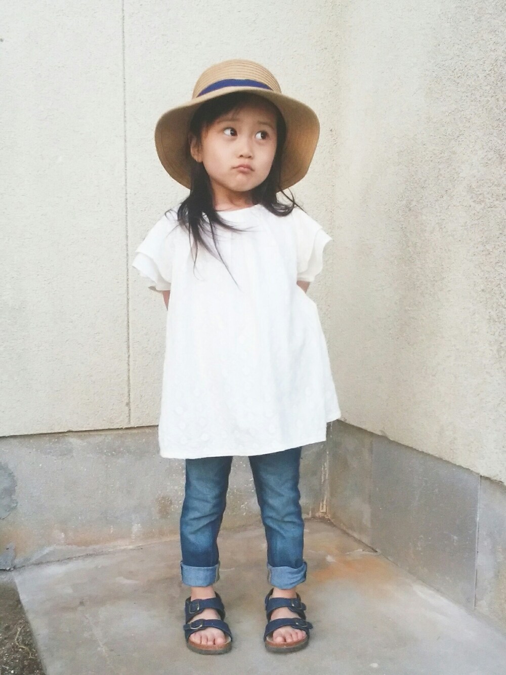 今日は暑かったので半袖にサンダルでした。 最近もお兄ちゃんの友達から男の子に間違われたので… 袖フリルにレース付き麦わら帽子で女の子らしく!!