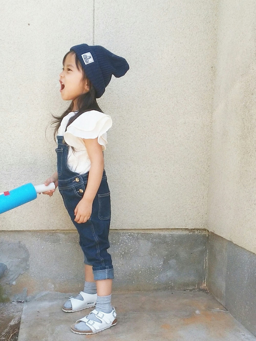 お兄ちゃんが作ってくれた武器を片手に吠えてます😅 形がキレイなPetit mainのサロペット。 女の子らしさを出すために、袖フリルのトップスを合わせました♡ ボリュームあるフリルだけど、パンツにもスカートにも合わせやすくてお気に入りです✨