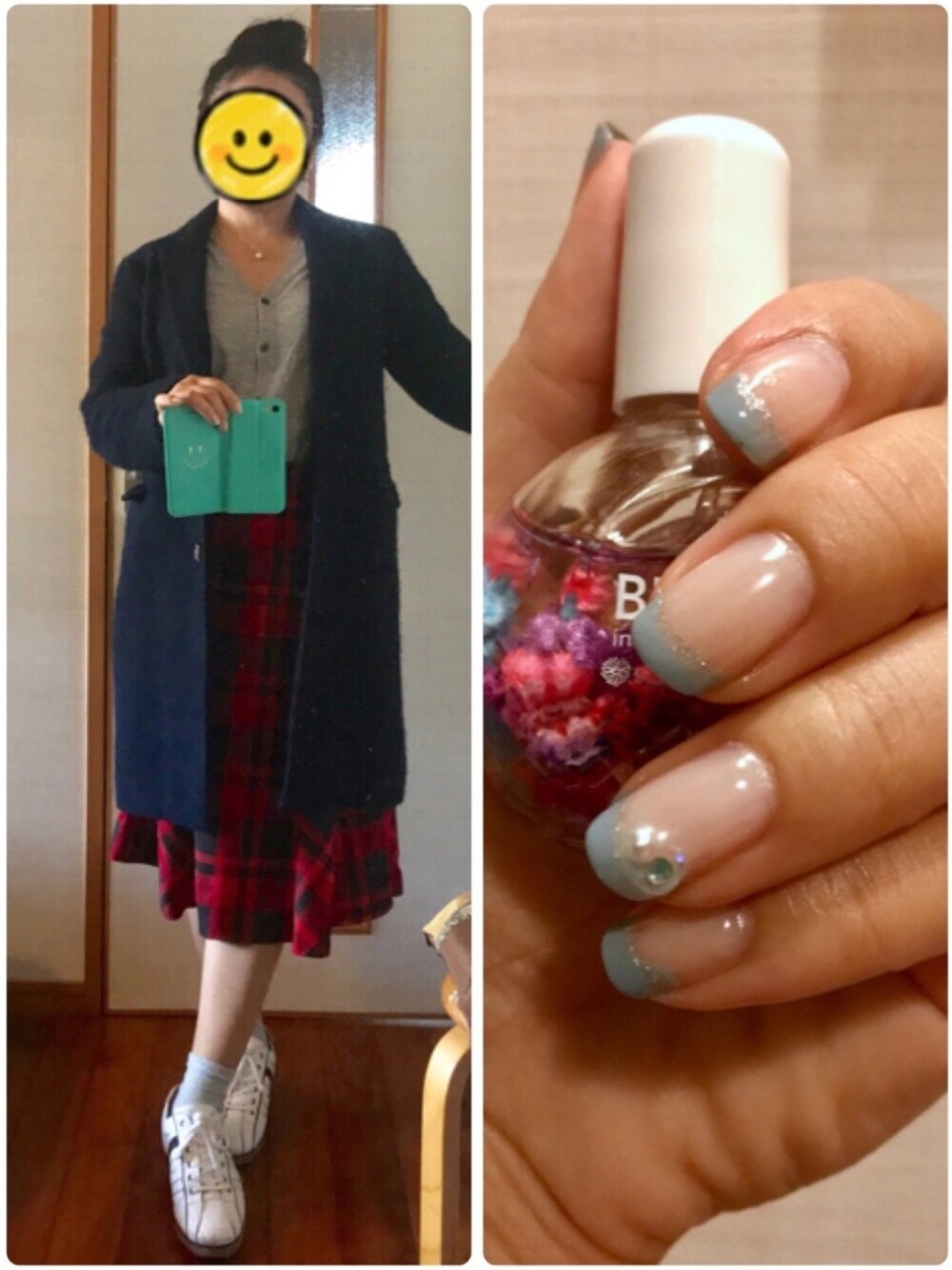 休日おでかけコーデ。 てっぺんお団子ヘア×チェックのスカートに靴下スニーカー。 ガーリーな組み合わせなので、トップスはデコルテのあいたシンプルカーディガンにして大人っぽくアレンジしています。 靴下コーデは、脚の形が向いてない気がして控えていたのですが(どっちかというとヒールでガシガシ歩くのが似合うタイプ…)、ふくらはぎ周りが見えない服なら大丈夫だと気付きました。寒いし、やっちゃえ。 首回りのスッキリ感を大事にして、ピアスはスタッドタイプのパール。 ネックレスは、一旦チェーンパールのネックレスを合わせてみたのですが、「カジュアルなディナー」感がでて、少しだけ華やかすぎる…ということで一粒タイプに取り替えました。昼間のおでかけにフィットした感じになって満足です。 服とネイルのバランスも、清純ガーリーネイルとガーリー同士で合っていると思います。色もネイビーのコートと青系リンクしますし。 1着しかないチェスターコートが連日大活躍。2着め買おうかな〜となっても、この辺りでは着用期間が短いから、つい後回しにしてしまいます。 実際、私のクローゼットの中にはネイビーのチェスターコートに合わないものが無いんですよね…2着め買う必然性が出てこない…。