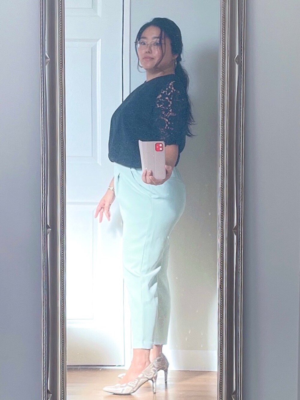 ミントグリーンのテーパードパンツが主役。 ぽっちゃり対策は、トップスのタックインする時に斜めにするのと、後毛です。