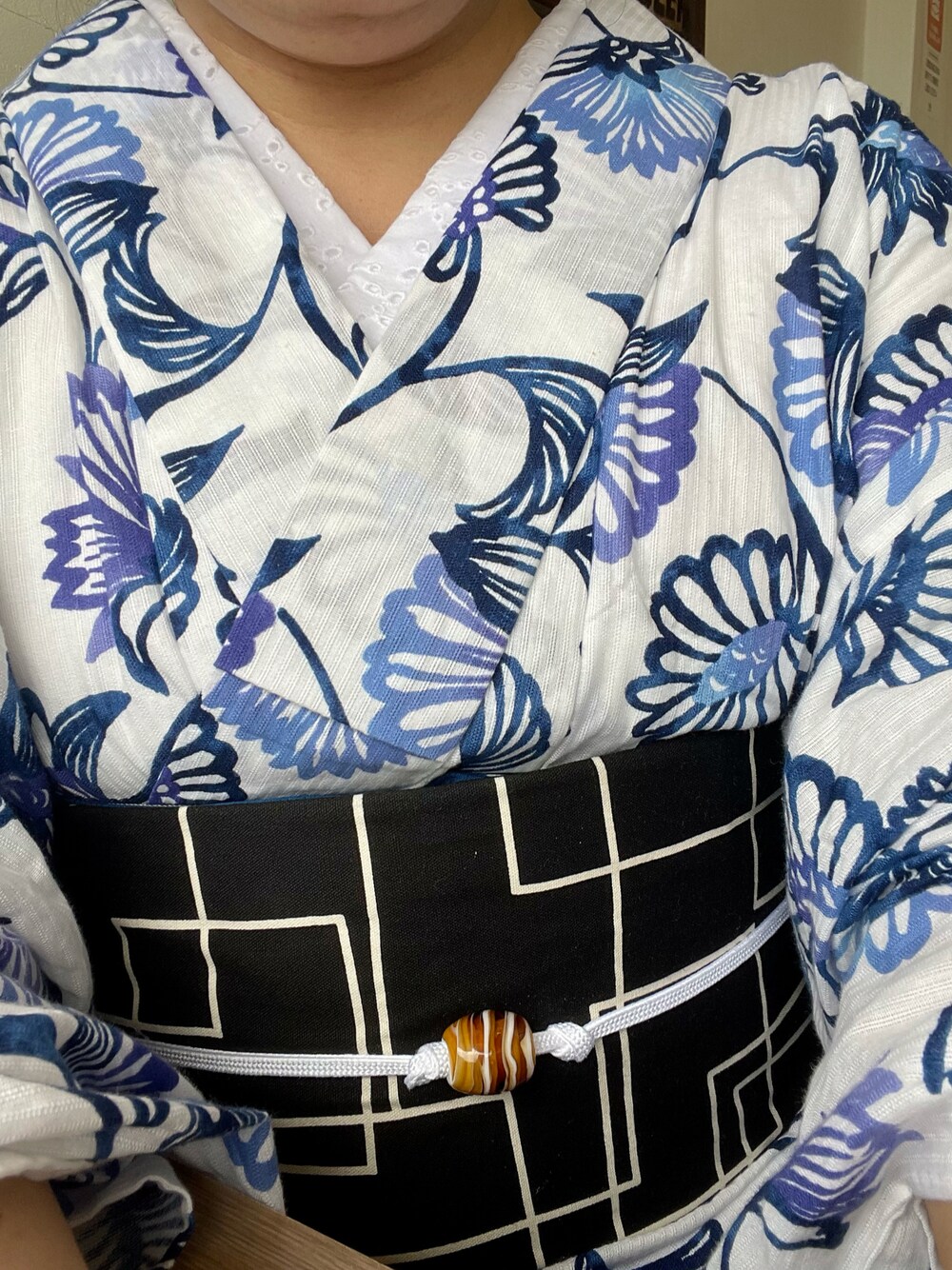 早起きして、ヤシ園のレストランで台湾朝食食べてお散歩。白地のしじら織に藍色〜青のグラデーションで花唐草が染められた浴衣兼着物。帯は幾何学模様のコットン名古屋帯。華やかな柄を引き締めて。