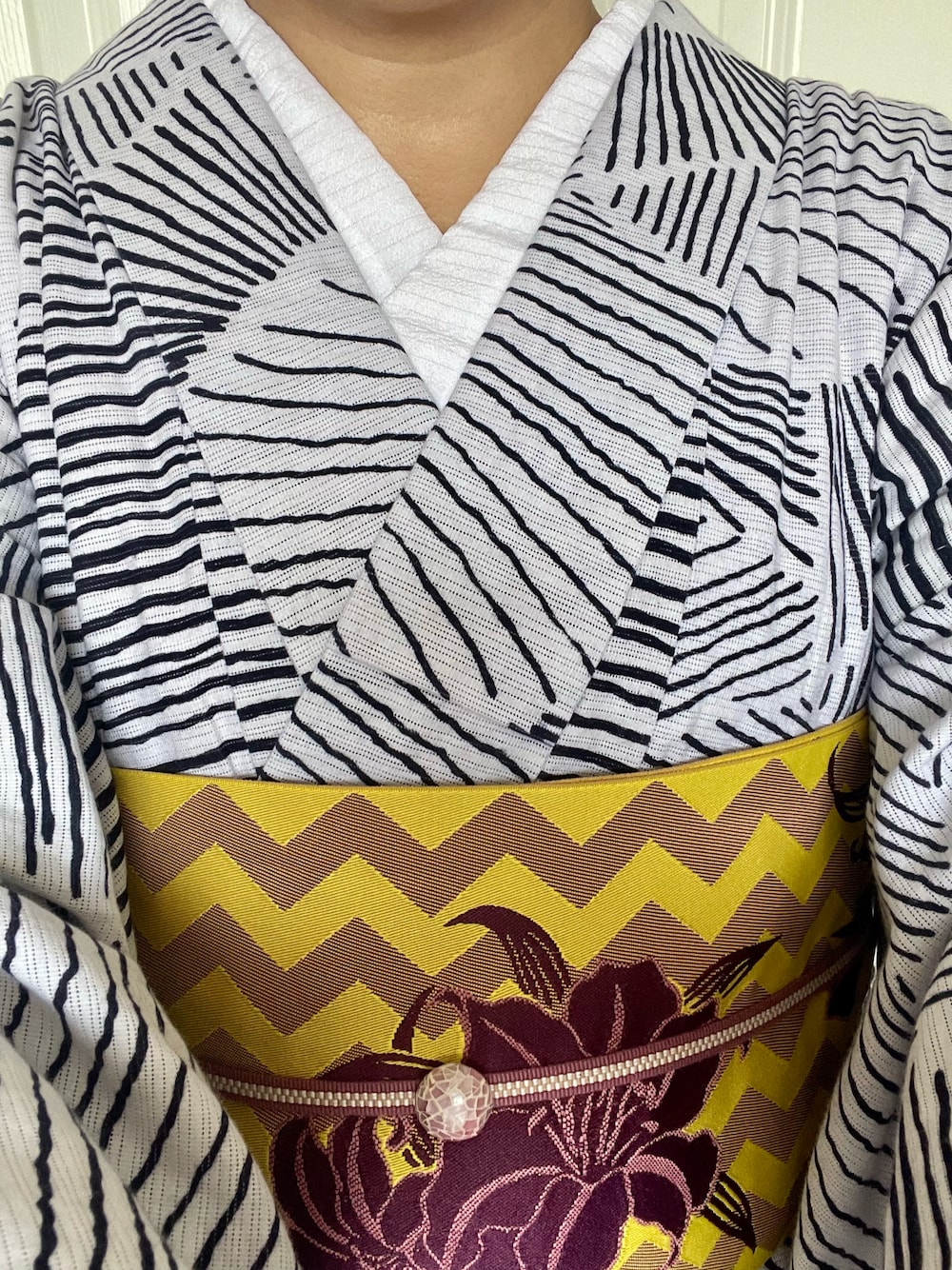 幾何学柄がアートな綿絽に、百合柄の帯。少し毒を含んだ色味が大正〜昭和初期のイメージ。