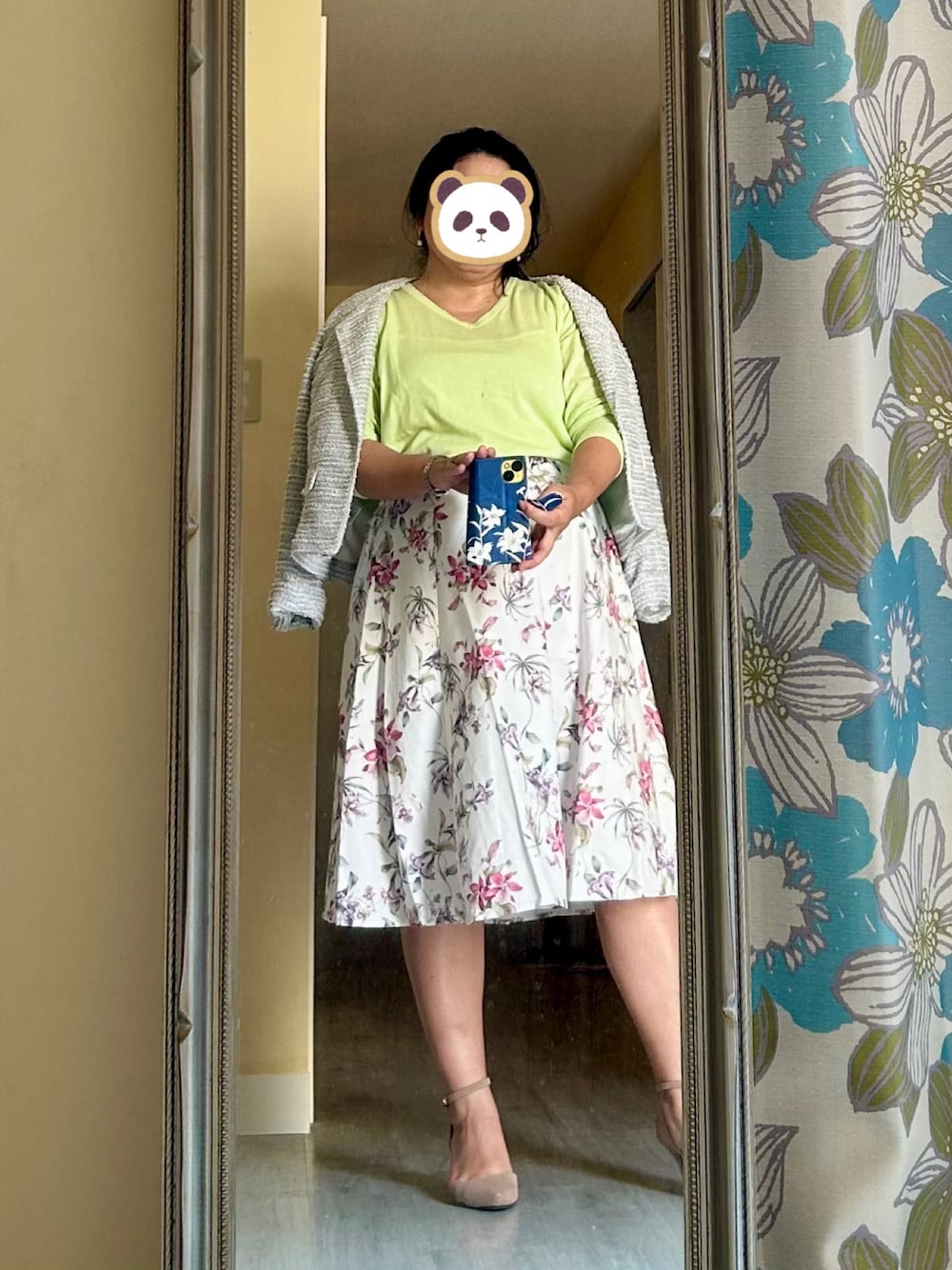 シンプルきれい色ニット×花柄スカート。本日24℃、ジャケットはいらないかもしれないけど、夕方スッと冷え込むかもしれないから持っていきます。