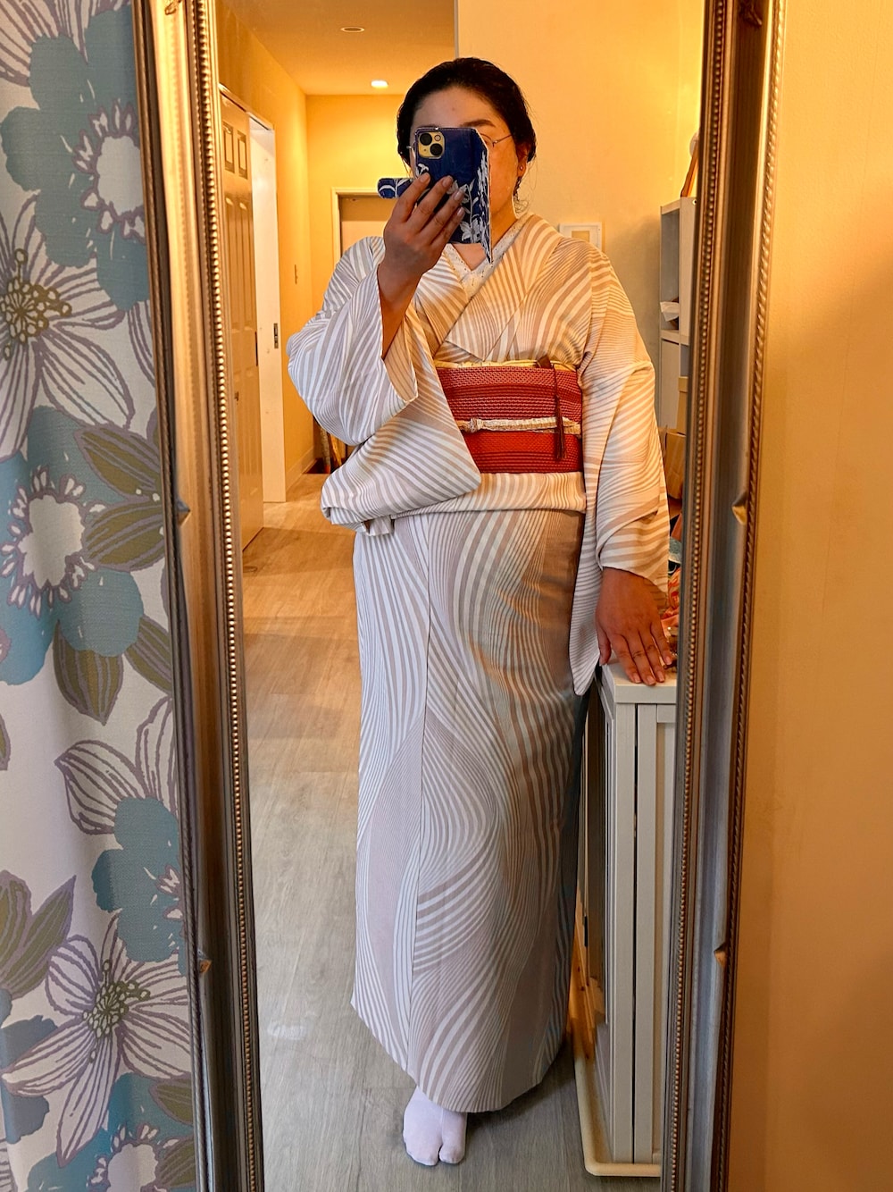 一昨日?は着付けがスッキリ決まらなかったので、同じ着物でリベンジです。着丈をほんの少し短めに、お尻にピタッとつく感じでタイトめに。シワや余りが出ないように空気を抜いて。 今日はスッキリ着られました♪嬉しい。