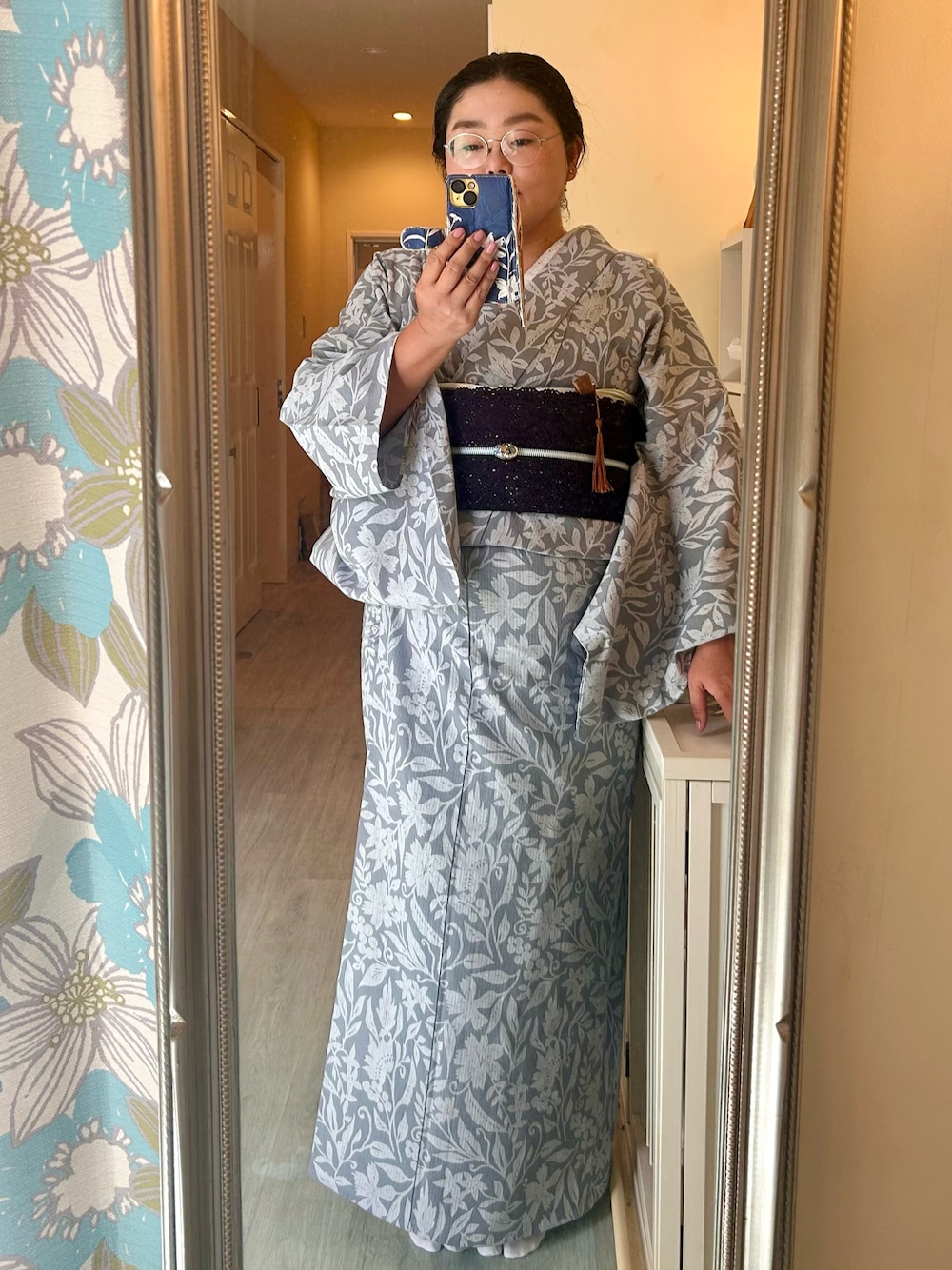 3年迷って白黒オトナ買いした、撫松庵のレース名古屋帯✨きゃわわ💕  着物はグレーの花柄が都会的!