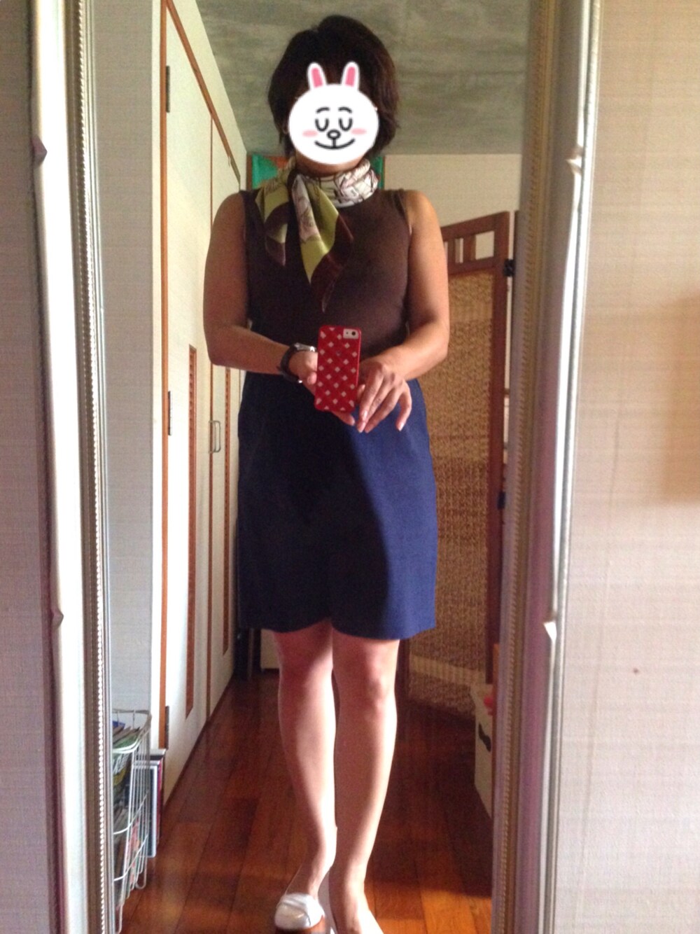 あまり活用できてないブラウンのカットソーに出番を作るためのコーデ。ネイビーとの取り合わせも悪くないかも。冷房対策はスカーフで。