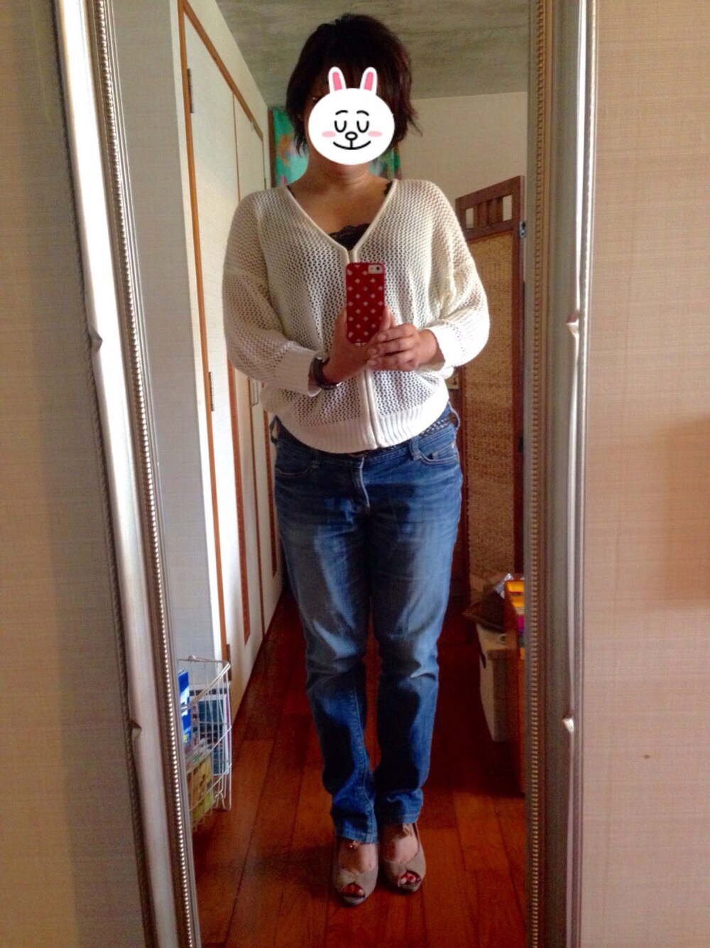 お盆休みで実家の留守番。いつどこから客が来るかわからないので、 ①デコルテ禁止(畳間でお客様に失礼のないように) ②脚出し禁止(同上) ③裾が広がるボトム禁止(フル回転の台所では危ない) ④ノースリーブ禁止 ⑤着崩しアレンジ禁止 ⑥親しみやすく爽やかな服装で …などなどのドレスコードをくぐり抜けて選ばれし最強☆無難コーデ‼︎‼︎ 写真ではあまり見えませんが、赤ペディキュアとほんのり赤リップで控えめなアクセントを。香水は「グリーンティー」。ここでも気を抜かず、ザ・無難‼︎