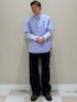 淡いブルーの半袖シャツにロングスリーブを重ねたレイヤードスタイルで、シンプルながら奥行きのある着こなしに。クリーンなカラーリングが春らしい軽やかさを演出しつつ、ワイドなデニムで程よくカジュアルダウン。足元は落ち着いたシューズで引き締め、大人っぽいバランスに仕上げています。 「きれいめ×ストリート」の絶妙なミックスが、今っぽさを引き立てる一着です。
