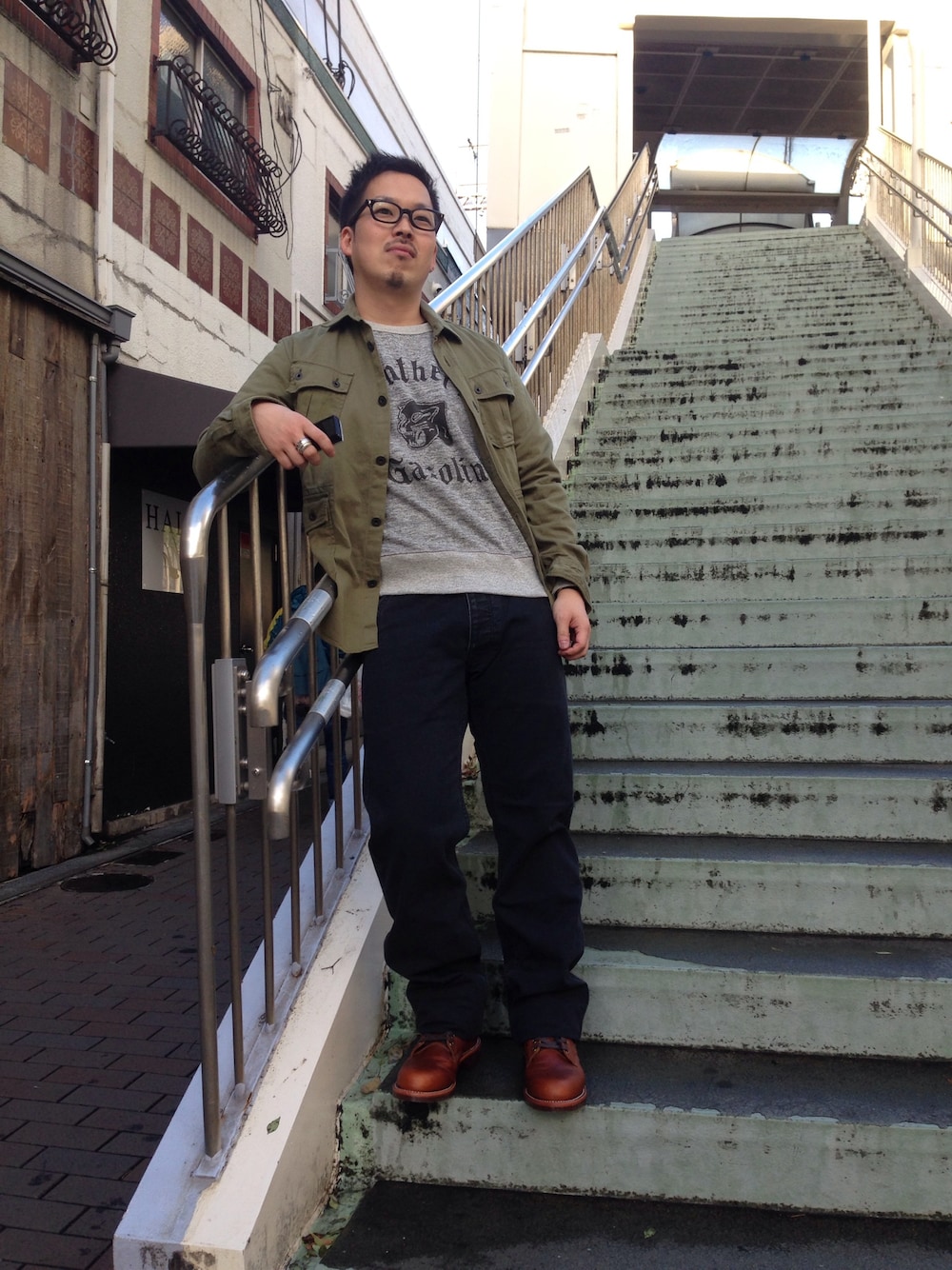 ジャケットライクなシャツにスウェットを合わせたアメカジコーデです。