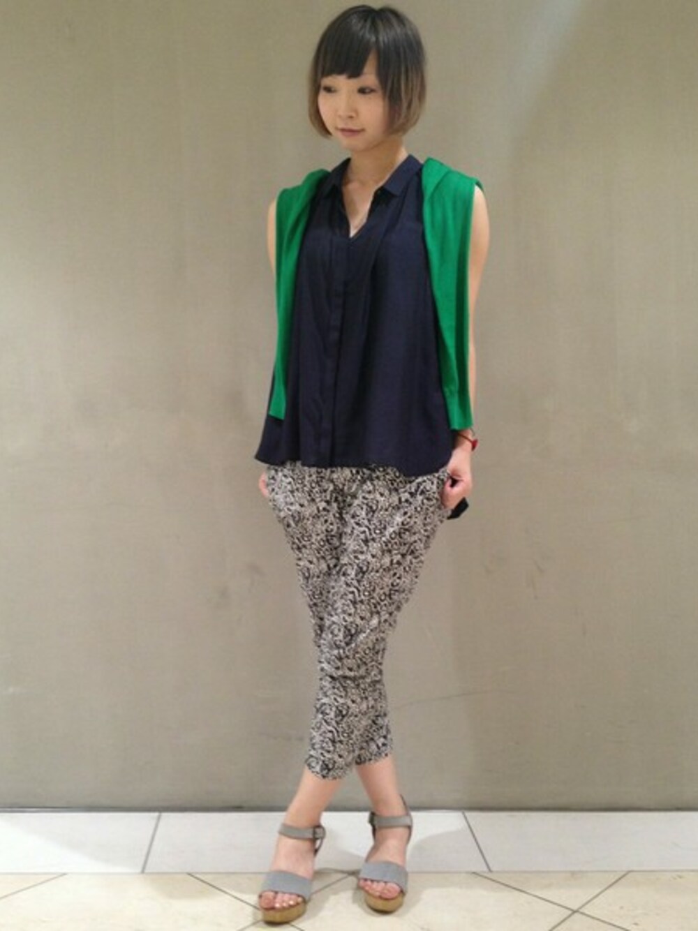 カジュアルなリバティパンツをブラウスで綺麗目にスタイリングしました。