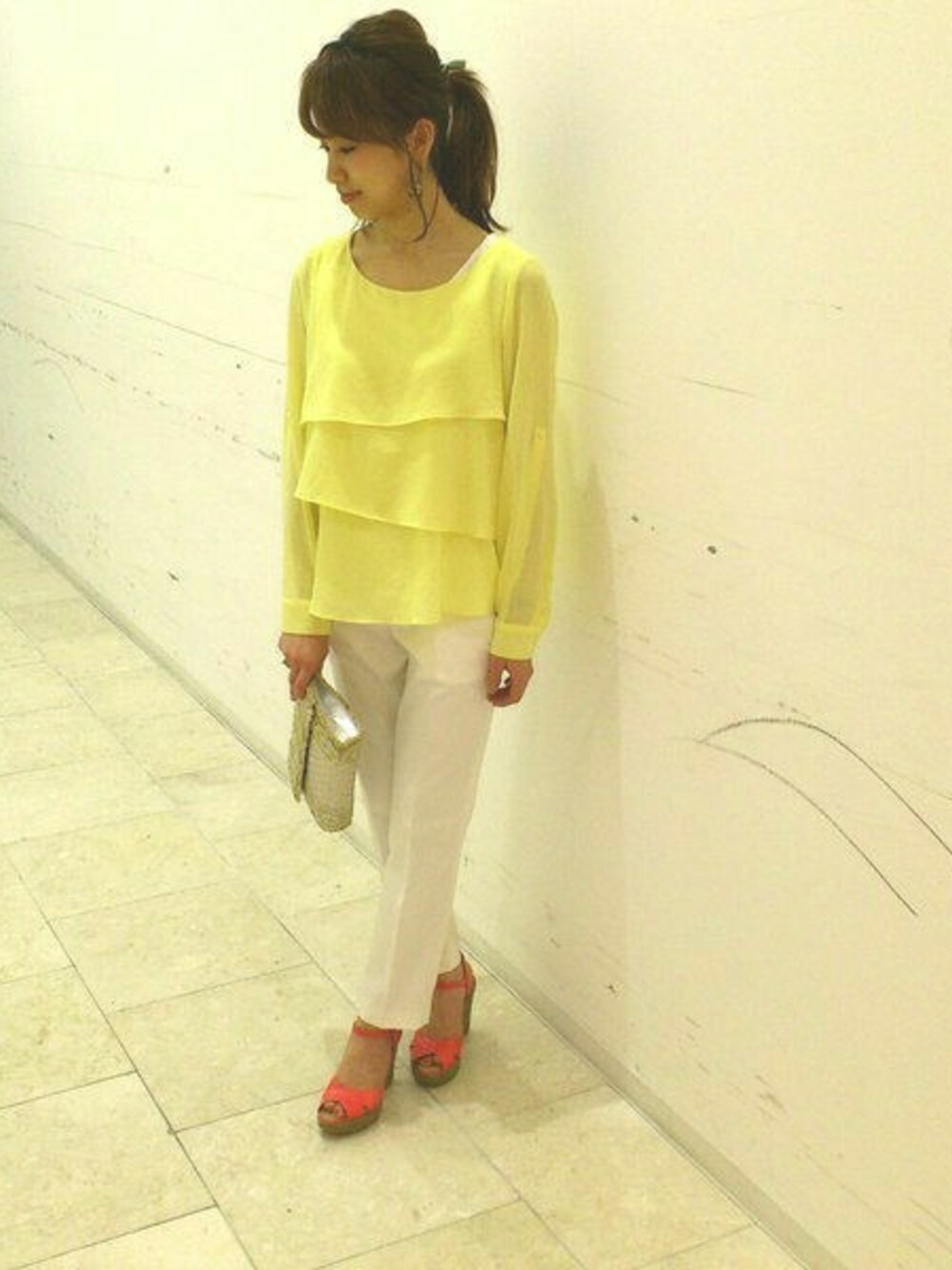 パステルカラーのティアードブラウスに白のパンツでフェミニンに!