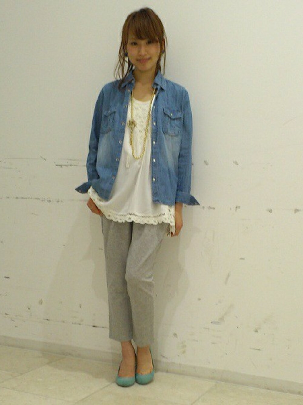 きれいめなレースキャミソールにスウェットパンツではずしました。 デニムシャツでカジュアルに春らしくコーディネートしました。