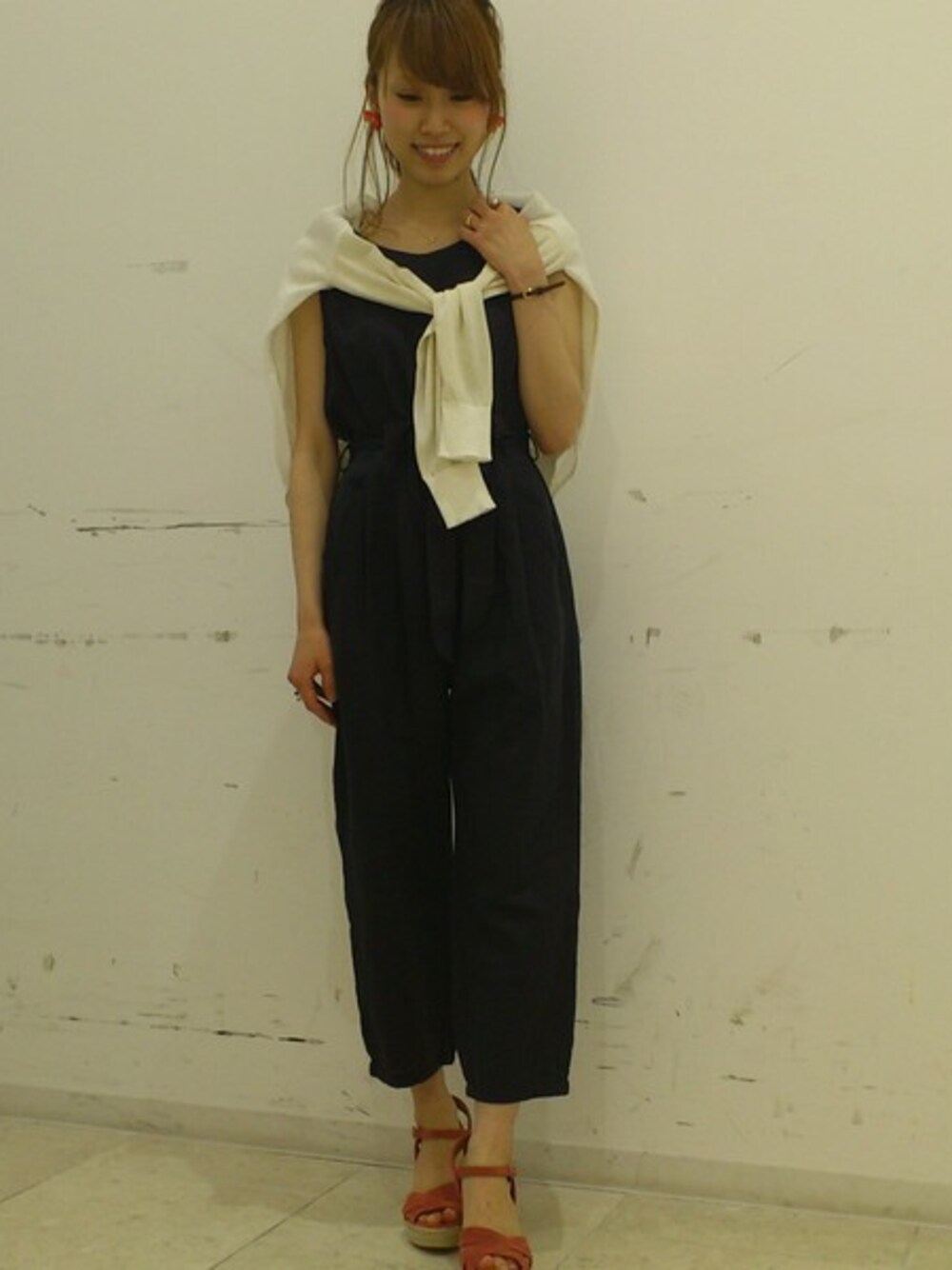 シンプルなオールインワンにはカーディガンを肩からかけてアクセントに。 ウェッジソールのサンダルでバランスをとりました★