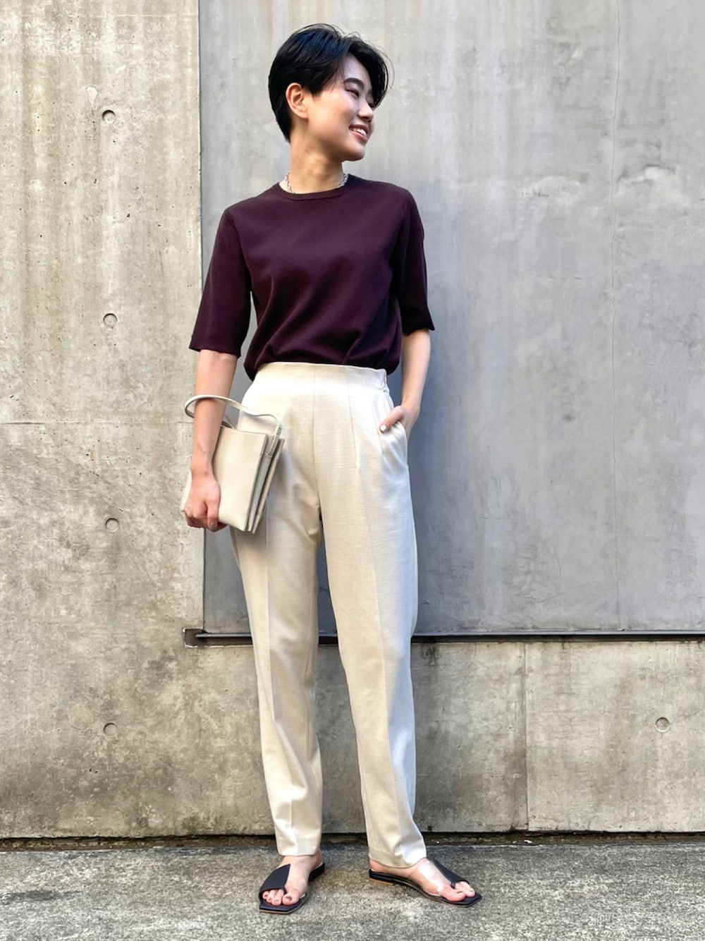 残暑でも秋色を取り入れられるニットTシャツ! ジャケットのインナーやTシャツでは カジュアル過ぎてしまう時にも最適です🌝 パンツはウエストラインに拘った美脚シルエット! 3シーズン素材で柔らかい穿き心地は手放せません✨