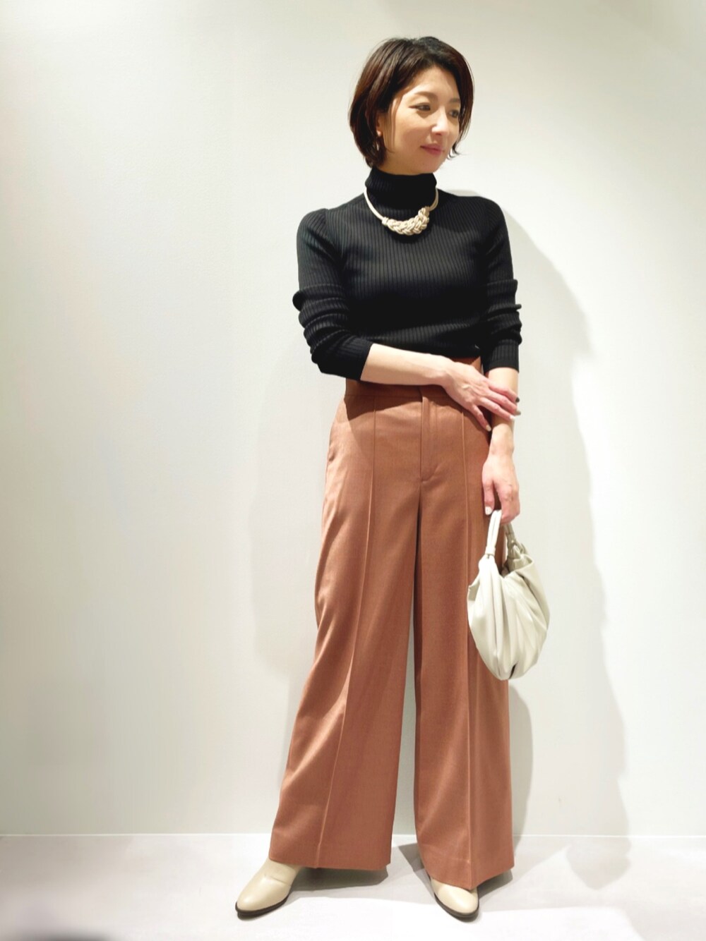 ご覧いただきありがとうございます!! カラーMIXのワイドパンツをご紹介いたします♪ 【ハイウエストストレートワイドパンツ】 センタープレスで広がりを抑えた綺麗なシルエットのワイドパンツ。 シルエットの綺麗さを生かしてシンプルに 黒リブタートル×ネックレスで合わせております♪ こちらのカラーは“テラコッタ”。 カラーをミックスした糸で編んでいるので、 他にはないカラーに仕上がっております!! 【シームレスタートルニット】 カリテの定番シームレスニットのリブタートル。 ポリエステルとウール素材を使っていて暖かく、 見頃とタートルとの境目にも縫い合わせが無いので 直接、素肌に着てもチクチク感が無く着やすいです。 二の腕回りのフィット感も気にならない人気のリブニット。 お色違いで何枚あっても着回しに便利です♪