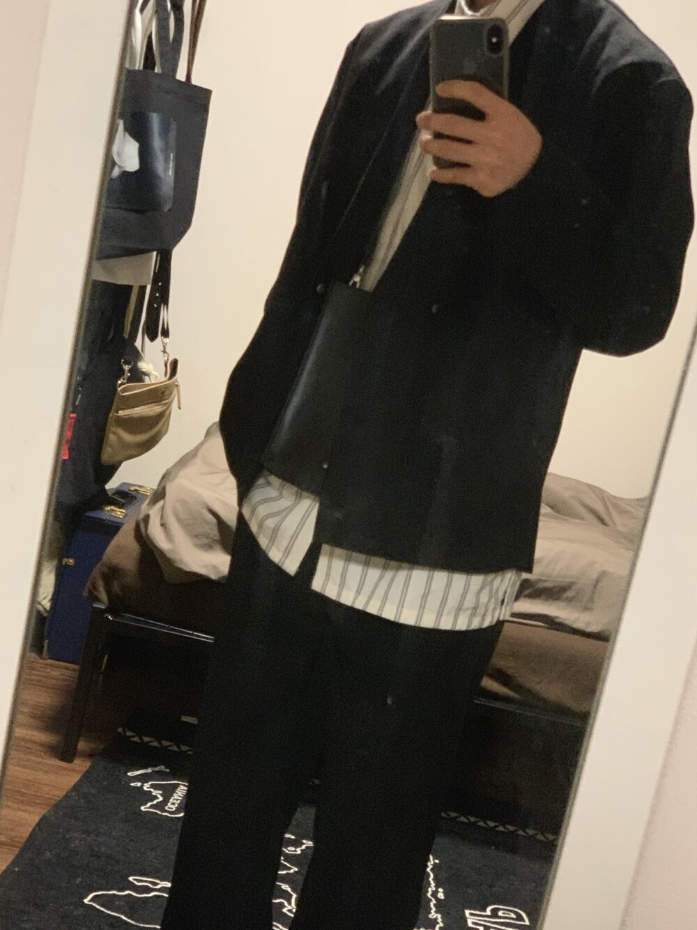 ーーーーーーーーーーーーーーーーー :"-✴︎~ Welcome to my page ~✴︎-": ーーーーーーーーーーーーーーーーー Follow返します、是非コメント宜しくお願いします🥱 ☆ポイント☆ ・モノトーン ・ストライプシャツ ・ノーカラージャケット