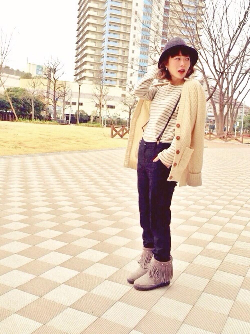 このズボンサスペンダーついてたの忘れてた!サスペンダーって少年のイメージ。 このムートンはミネトンカのSHIPS別注です。たっぷりのフリンジがポイント♡ Hat: used Knit: iliann loeb