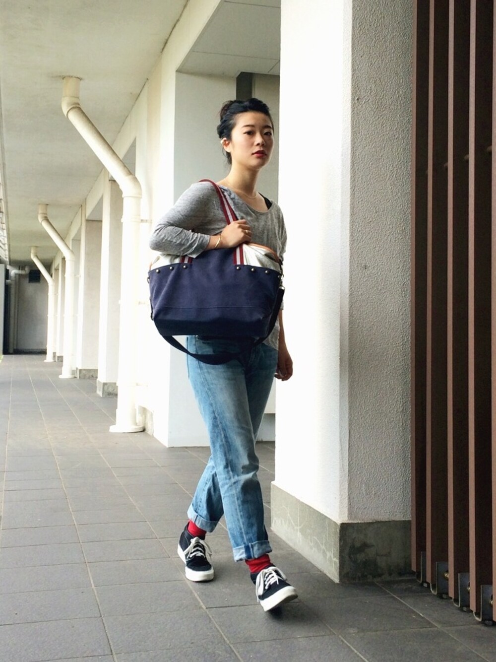 最近営業マンです。 なので今日みたいな外出なくて、仕事がドン溜まりの日には、ラクな格好が1番! 家⇄会社だけの日にするつもりで、校了前の漫画家みたいな服装でしたが… そんな日に限ってご飯のお誘いが入る!!! 赤靴下ってデニムとスニーカーに合わせたら絶対おしゃれになる万能アイテムだと思ってたのにスーパー裏切られました。 靴の中押し込んで石田純一みたいにします。
