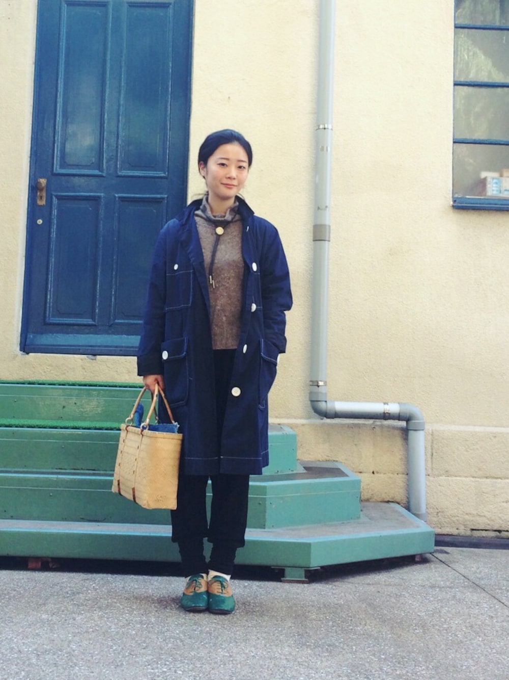 緑と青のコーデ 合わせにくい竹かごですが、どんなカバンよりも使いやすい。物の収まり具合が秀逸です。
