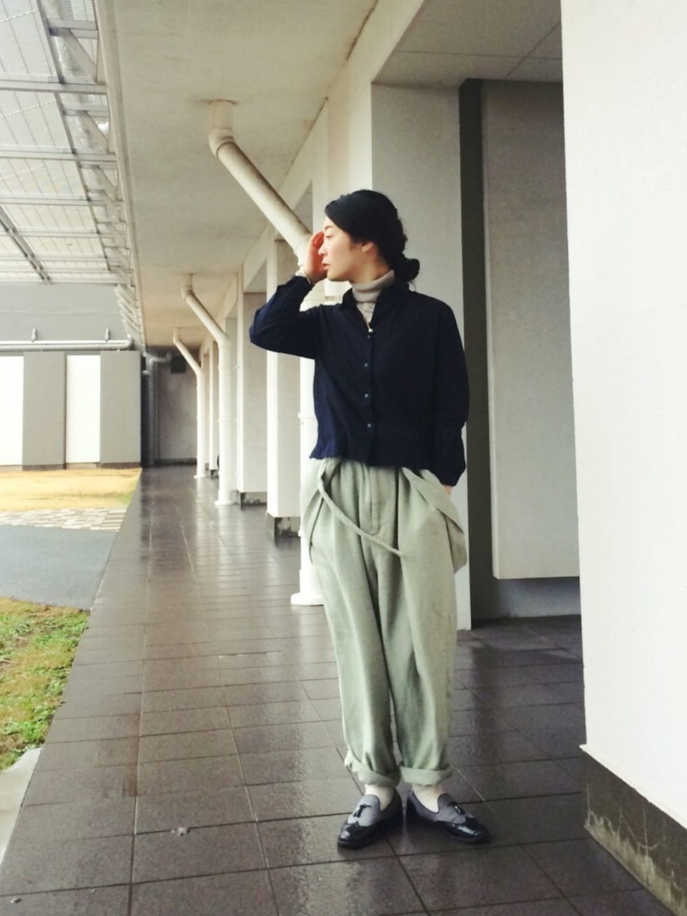 シャツon タートルネック。 ネイビーとミントグリーンって意外と好きかも! 雨で寒いので、あったかい格好で◎
