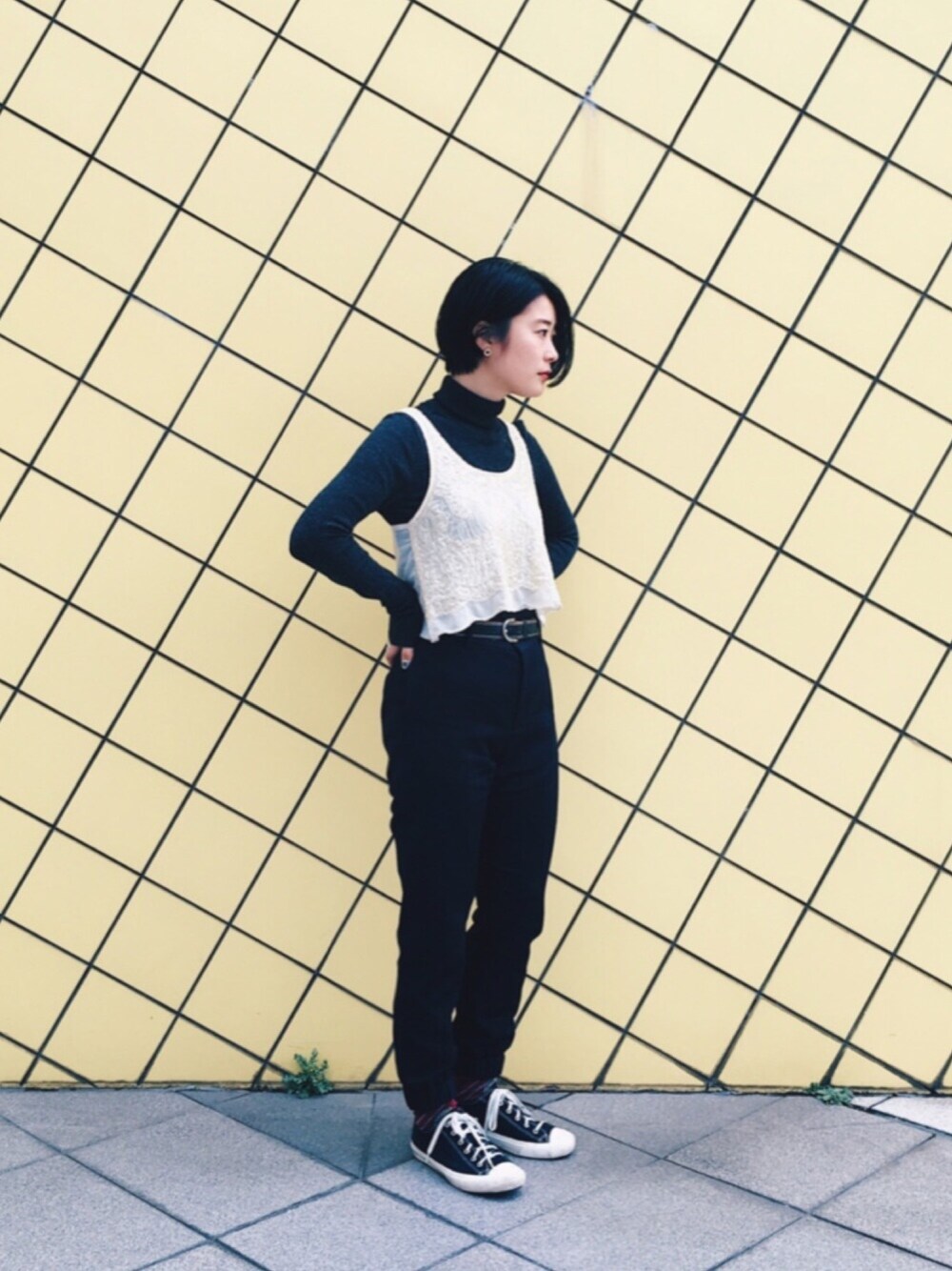 kayaのニット/セーター「首のチクチクをおさえた・天竺洗えるタートルネック 婦人S・チャコールグレー 」を使ったコーディネート