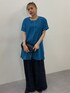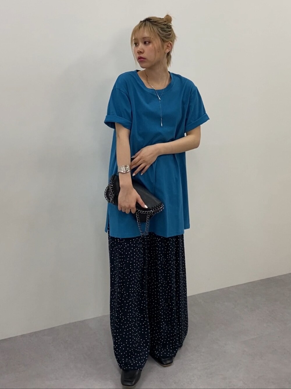 少しゆるいシルエットのチュニック体のラインをひろいにくく 体型カバーできる優秀アイテム。 夏らしいカラーが今年は追加されています! 接触冷感付きのパンツと合わせてゆるっとコーデに 暑い夏にお勧めのコーデです♪