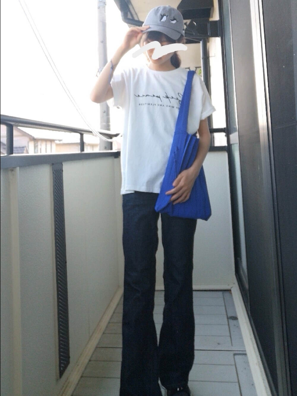 筆記体ロゴの白Tとデニムで爽やかさを意識しました。フレアシルエットで、カジュアルさの中にもきれいめ要素を。