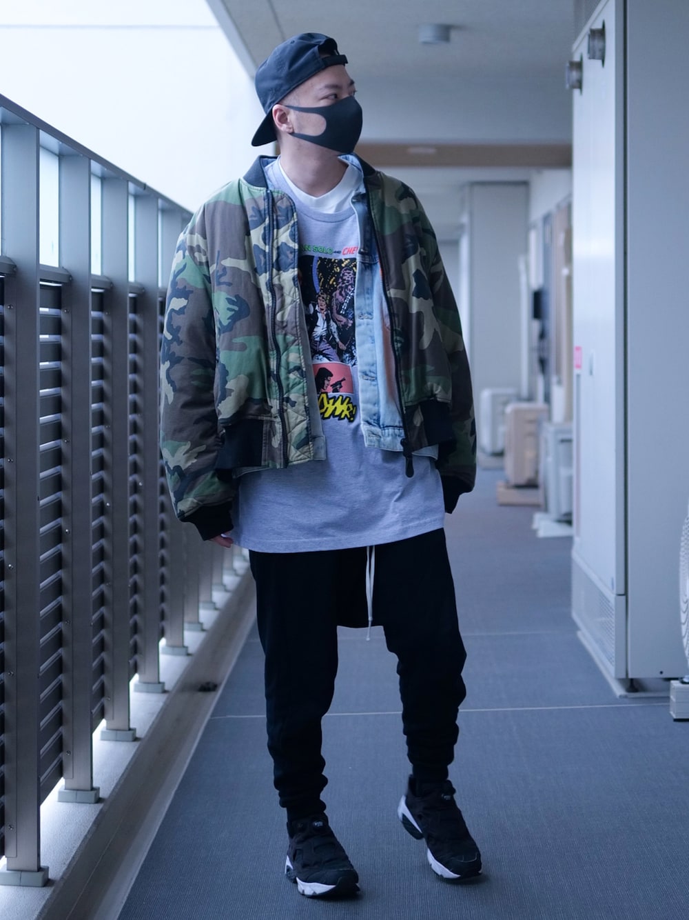 なつかしい感じのコーデ MA-1だけだと弱いので、デニムジャケットをクッション的に使いました 昨日久しぶりに実店舗で買い物したTシャツ、XXLでバックプリントも派手だから夏に着たい