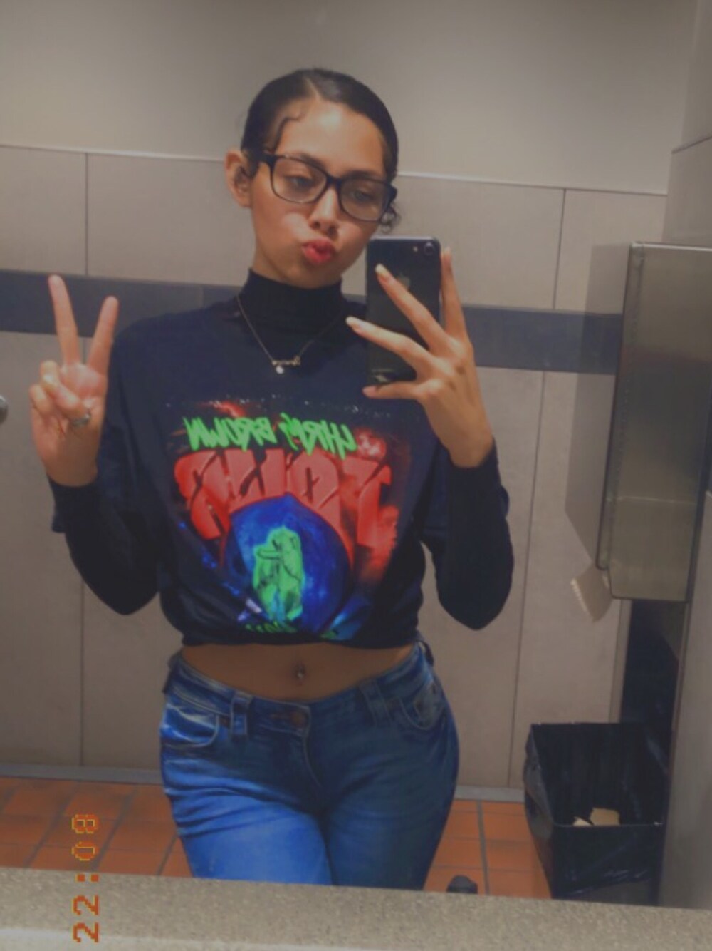 Chris brown heart break on a full moon concert T, over a black turtle neck from forever21. Along with True Religion skinny jeans and black thick rimmed coach glasses.