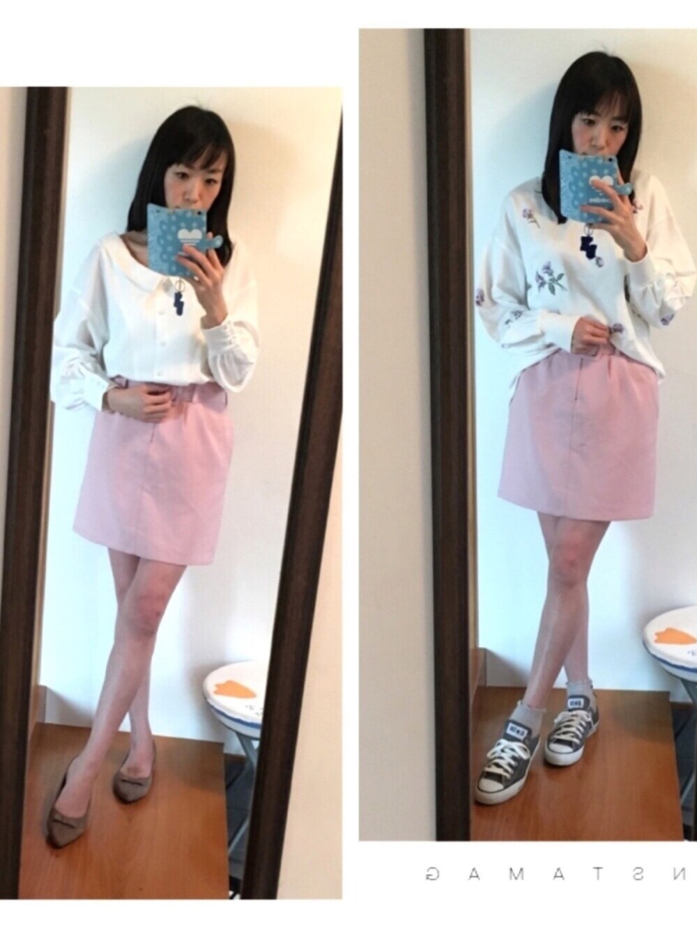 皆さまこんにちは😊 また少しサボりました…😞💦ちょっと疲れ気味ですが、まだまだ水曜日…ほどほどに頑張っていきます(´・ω・`;) いいね、SAVEなどいつもありがとうございます😊 今日はNewアイテム載せていきます🌸 本日のコーデ💖 大好きなNICE CLAUPの新作刺繍スエット🌸 いつもの⁈イロチ買いをしてしまいました😅 ホワイトはバラの刺繍が紫で、ホントにカワイイ…💖ちゃんと背中側にも刺繍入ってマス😍イロチのネイビーは小窓に載せました💙 公式オンラインでは既に全色完売のようです💦 昨日店頭に並んだばかりですが、ネイビーは出ているだけみたいでした💦 そしてそして、ゆるっとシルエットがとってもかわいいスキッパーシャツ✨こちら前後2wayでゴザイマス✨鎖骨が綺麗に…見えてない(⌒-⌒; )💦 杢グレーとくすみピンクがありましたが、私はホワイトに。どちらも壁と同化してるし💦 ベルト付きのタイトスカートは私にはかわいすぎた気もしますが😅トップスに合わせて💖