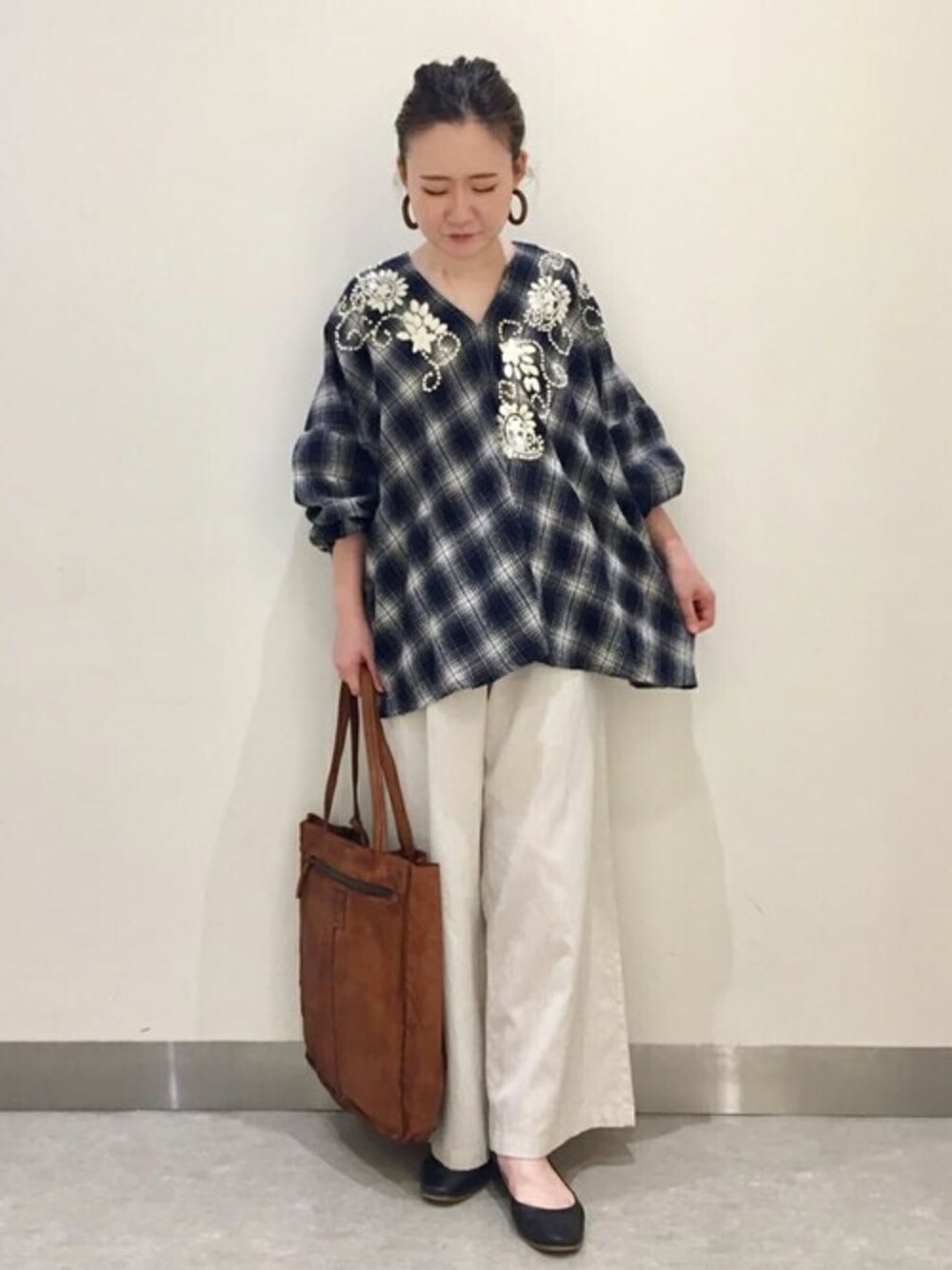 shimaのシャツ/ブラウス「ウールチェックハンド刺繍ブラウス」を使ったコーディネート