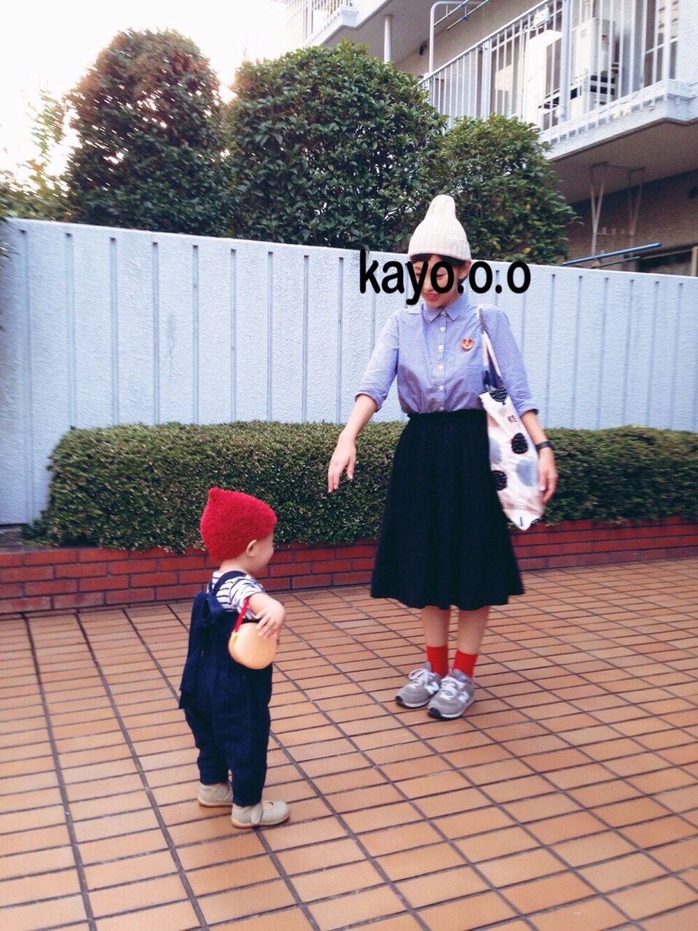 今日の親子コーデ◡̈♥︎ 娘のサロペットととんがり帽子と私のスカートはハンドメイドです♩.*
