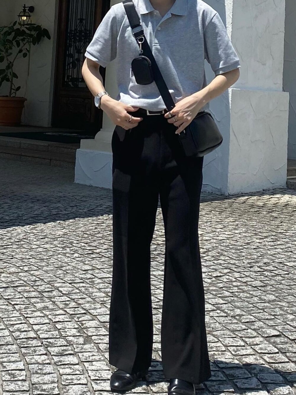 グレー系のポロシャツ、ブラック系のドレスシューズを着用したメンズの春コーディネートの1枚目の写真
