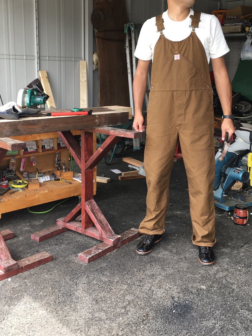 ガレージ内で作業をする作業者。 オーバーオールは圧迫無くて楽ちんです。 #ヘッドライト #トーヨーエンタープライズ #シュガーケーン #オーバーオール #テイラースティッチ