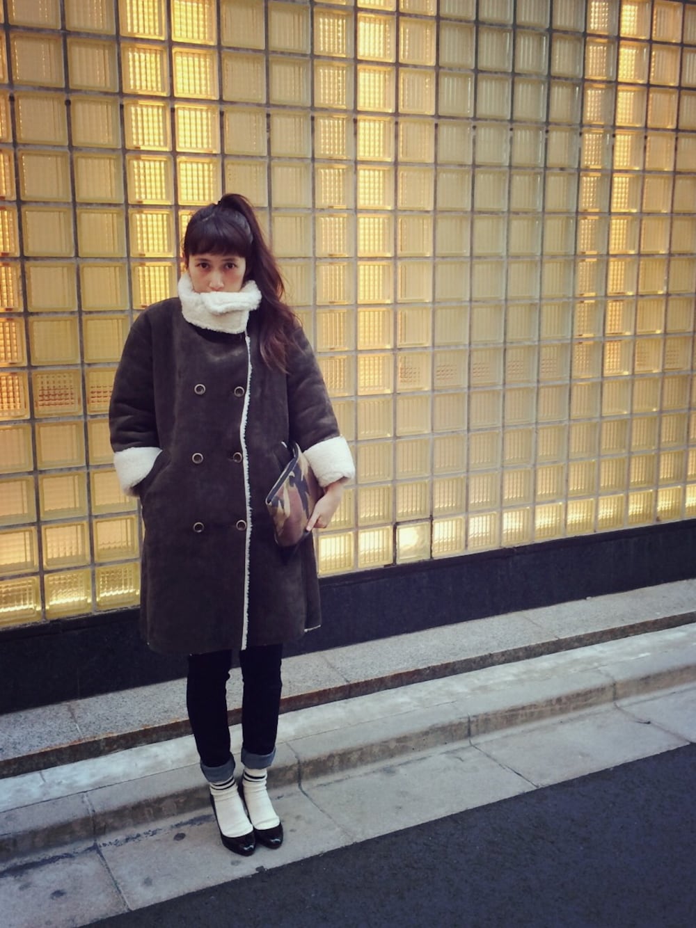 Kazumiのムートンコート「ハイネックダブルムートンコート」を使ったコーディネート