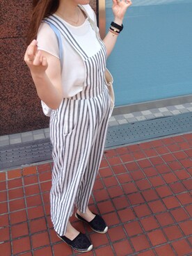 「SLY(スライ)のラメSTRIPE WIDE SALOPETTE(サロペット/オーバーオール、グレー系)」を使った、ゆかつんさん(レディース・162cm)の春コーディネート