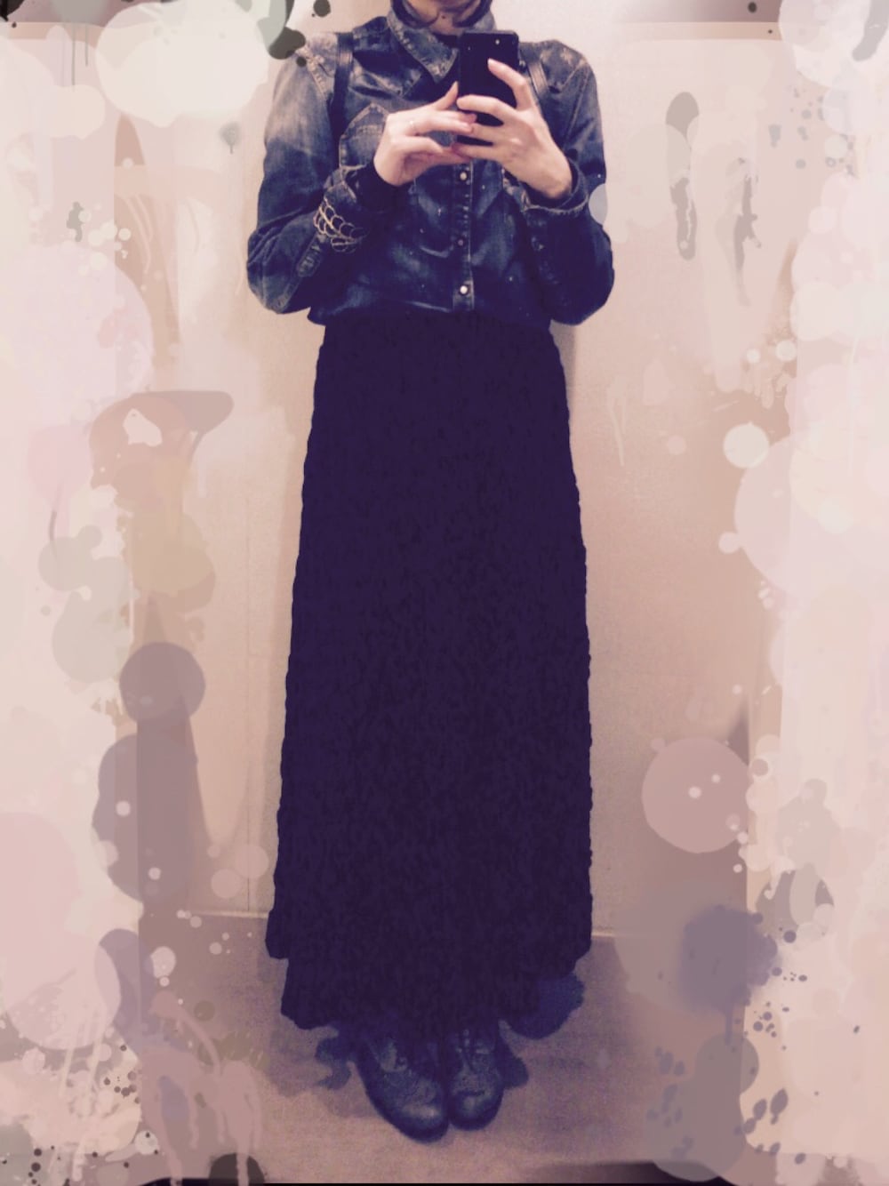 2017.11.11 メンズのデニムシャツ×ニットスカート レースインナーを袖から覗かせて、ちょっぴり女子。
