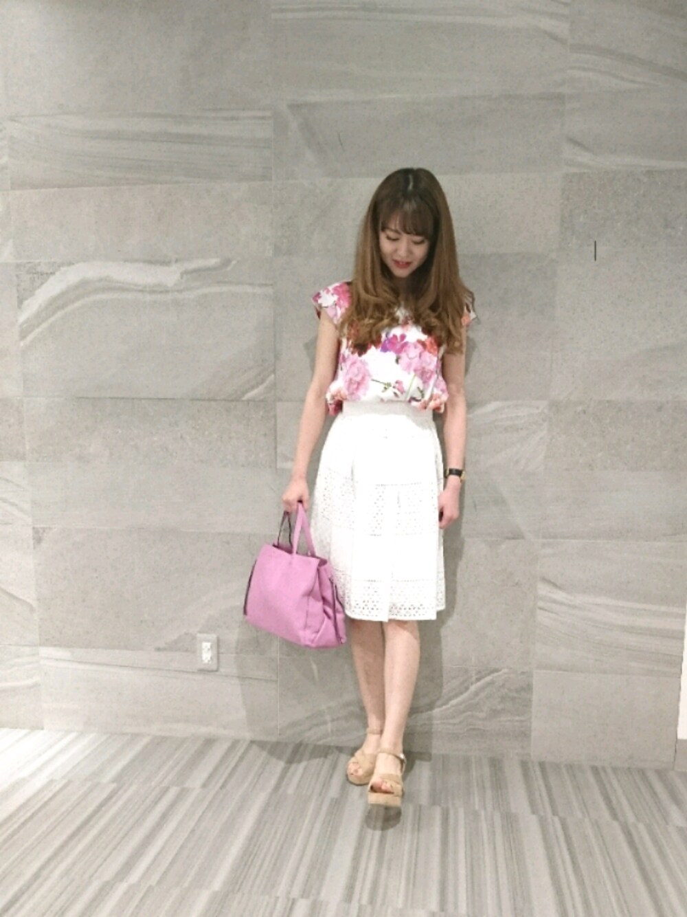 10-81-04-012 30-81-08-806 エンブロイダリーレースで女性らしいタックスカート。綺麗なスカートに大柄のフラワー柄のブラウスが映えます✨
