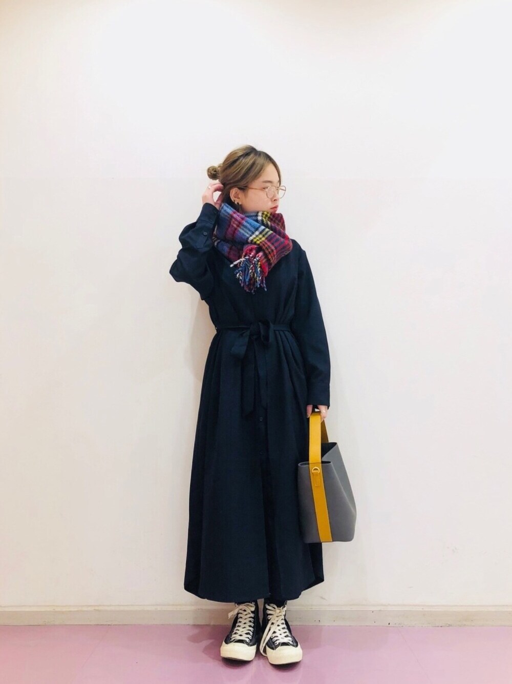 KBF+ の万能すぎるワンピースが再入荷しました ちょっと知的にしたい気分でした 眼鏡×チェックがかわいい