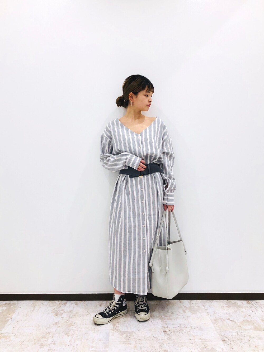 全身グレー系でまとめたい気分 このストライプワンピは羽織にもできるので着まわし抜群です