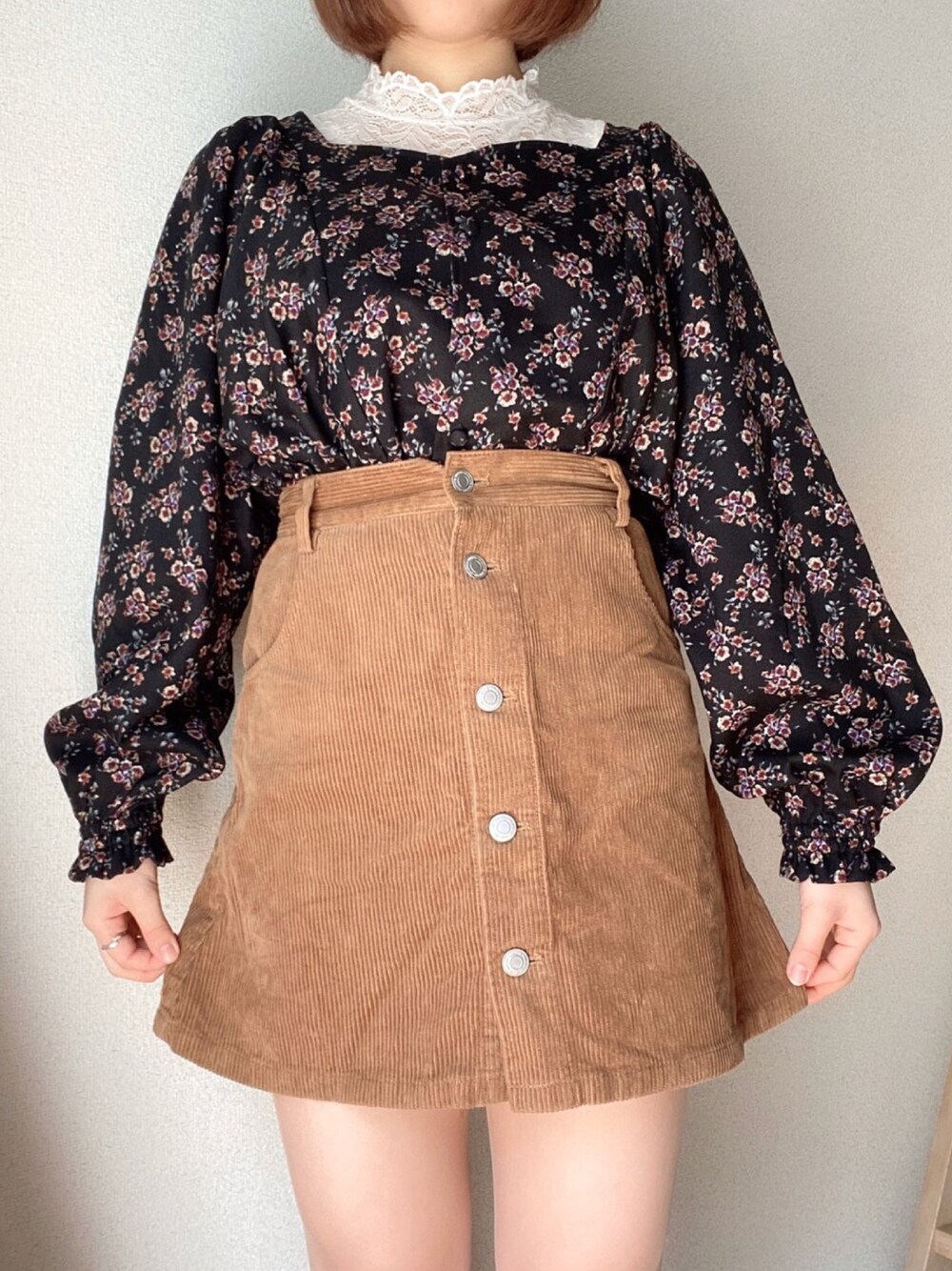 春に活躍する花柄ブラウス💐** インナーは黒のレースキャミソールでも可愛いと思う❤︎ とりあえずボトムスに困ったら、 ブラウンスカートを履いておけば間違いナシ👌🏻
